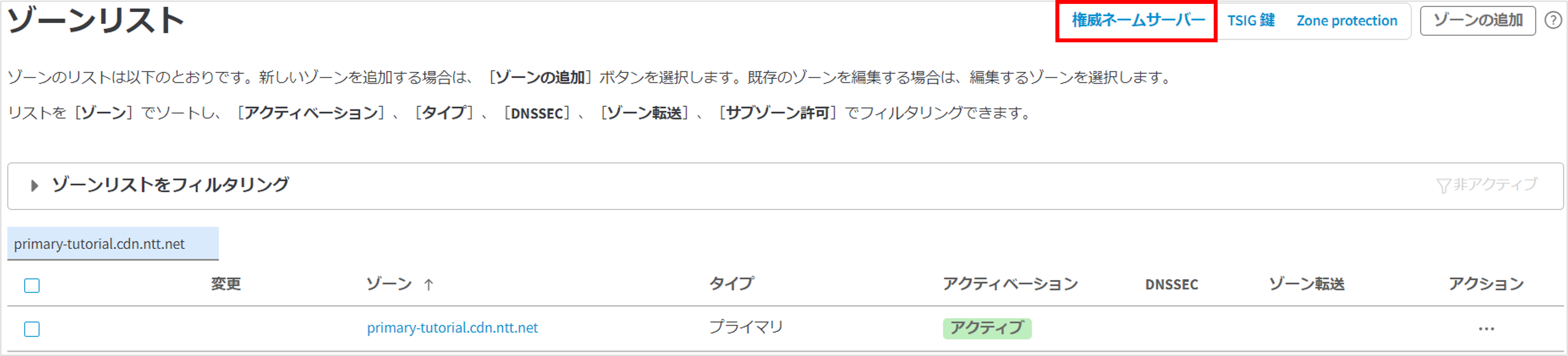 設定一覧画面が表示されます。画面右上の「権威ネームサーバー」をクリックします。