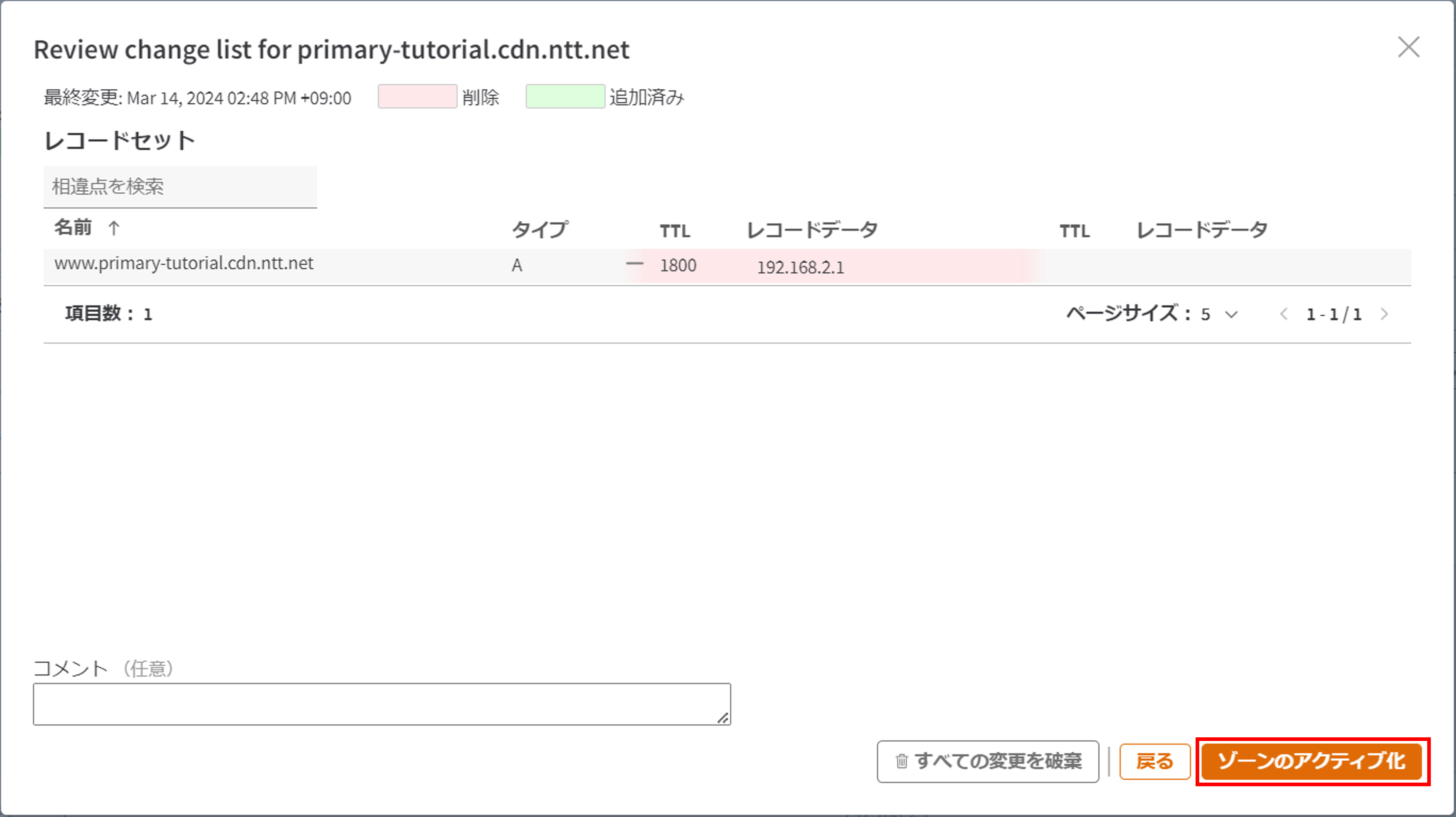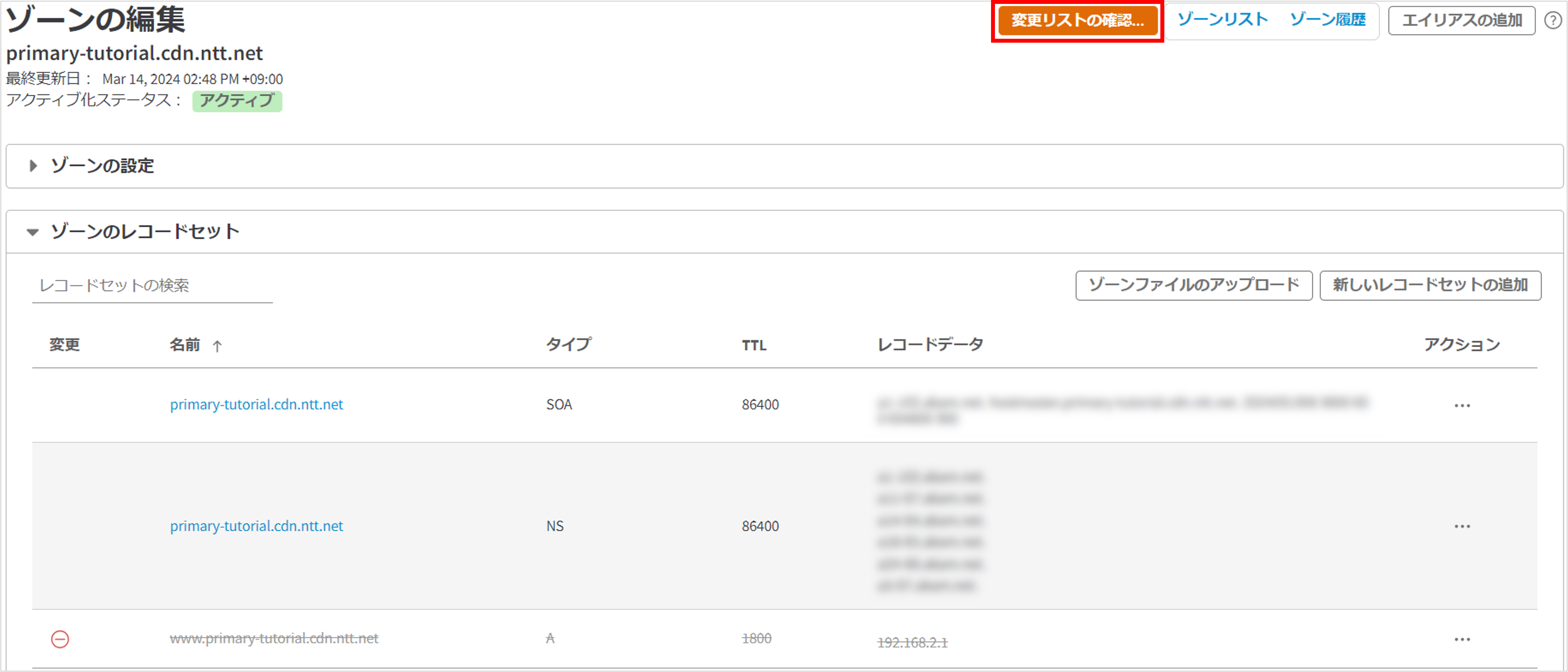 レコード設定の一覧画面が表示されます。「変更リストの確認…」をクリックします。