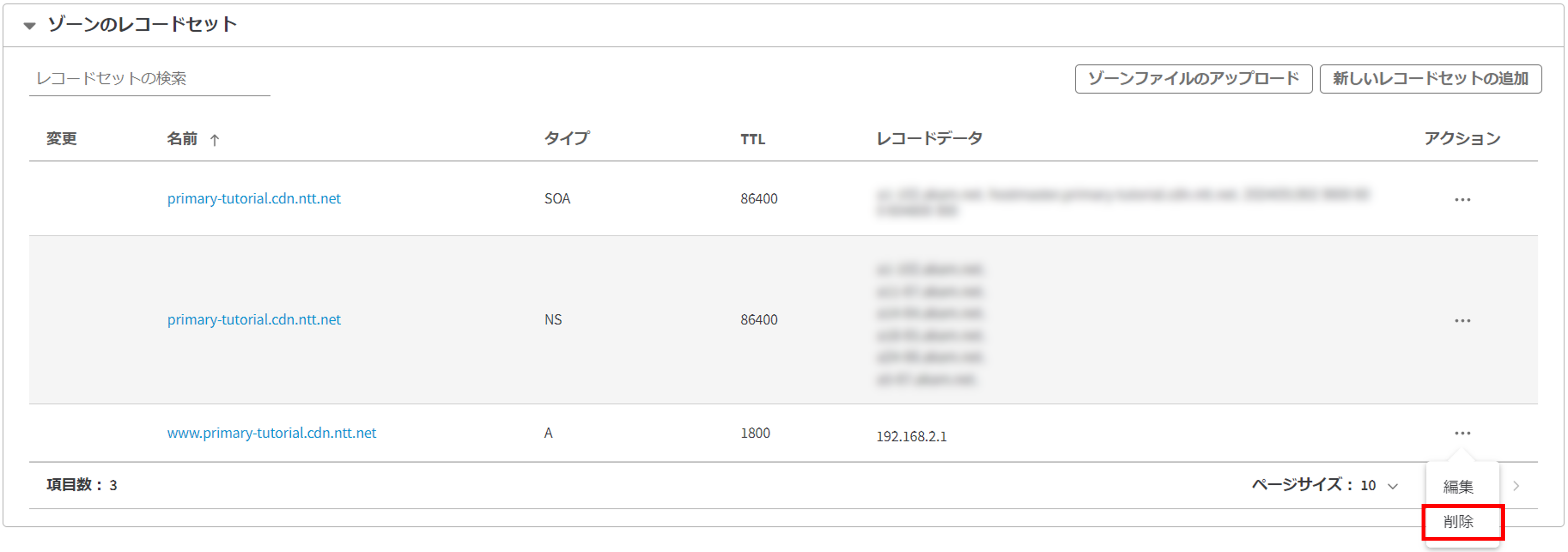 レコード設定の一覧画面が表示されます。削除対象のレコード右側の「アクション」から「削除」をクリックします。