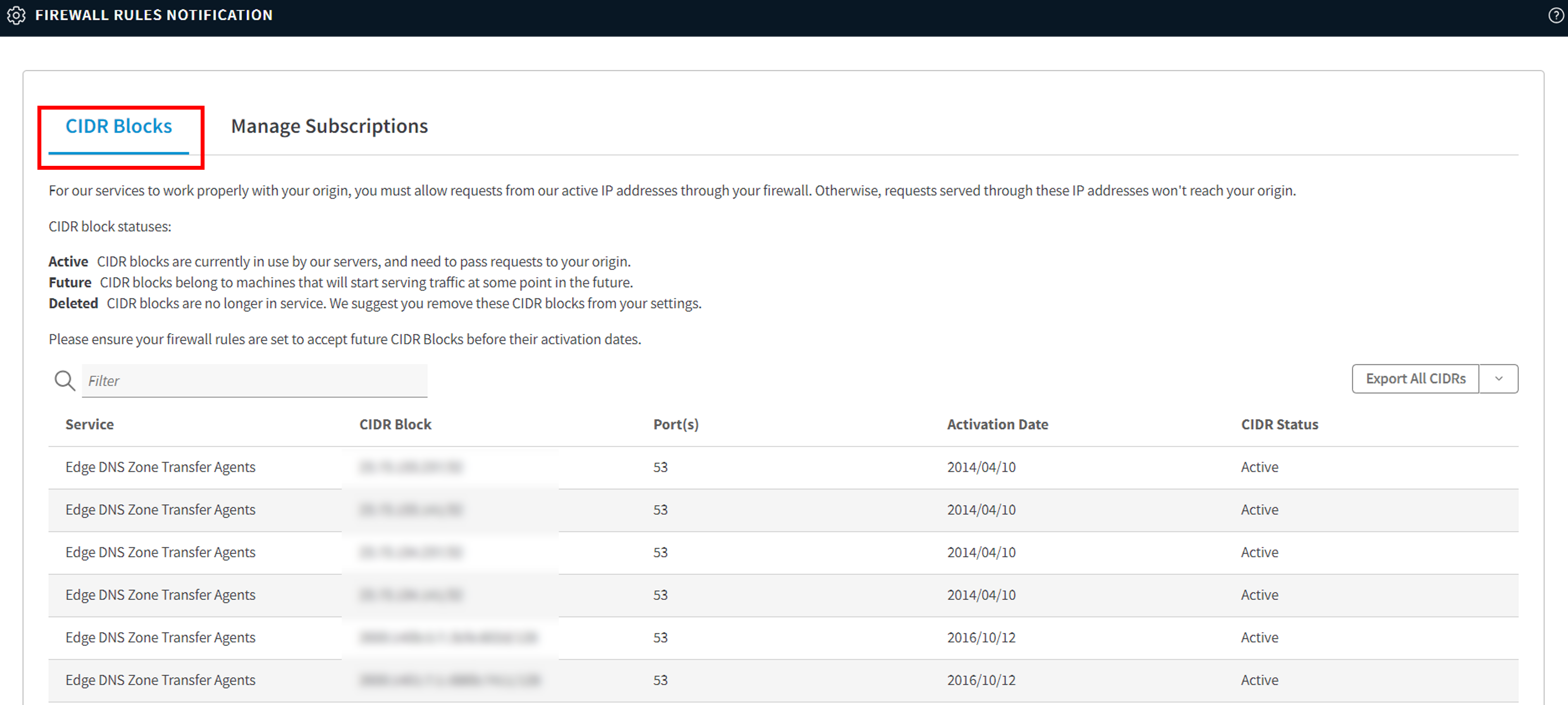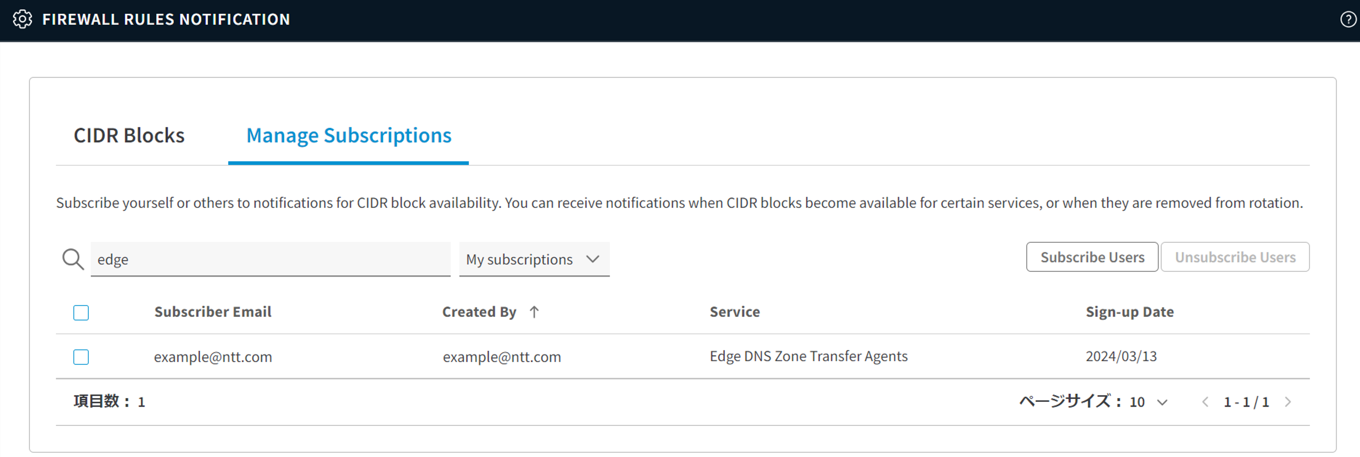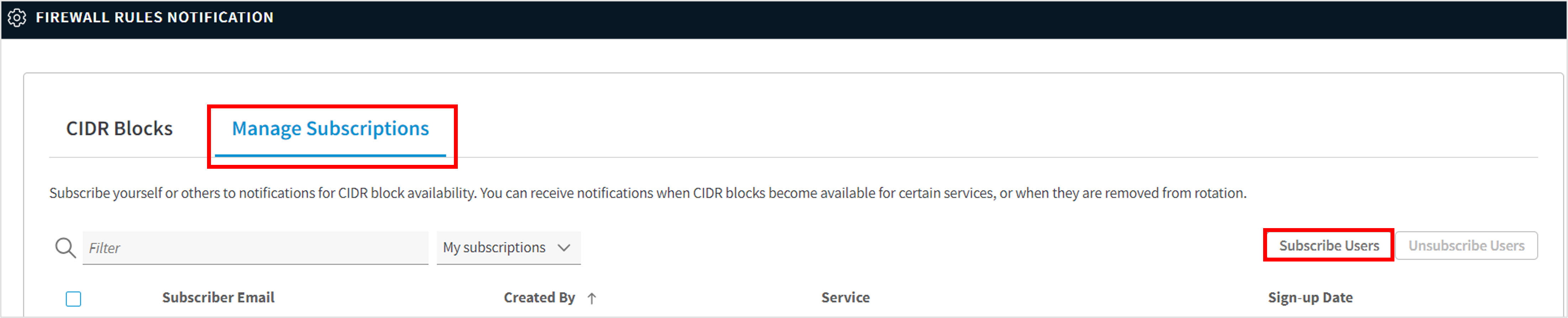 ファイアウォール・ルール通知の設定一覧画面が表示されます。「Manage Subscriptions」タブを選択し、「Subscribe Users」をクリックします。