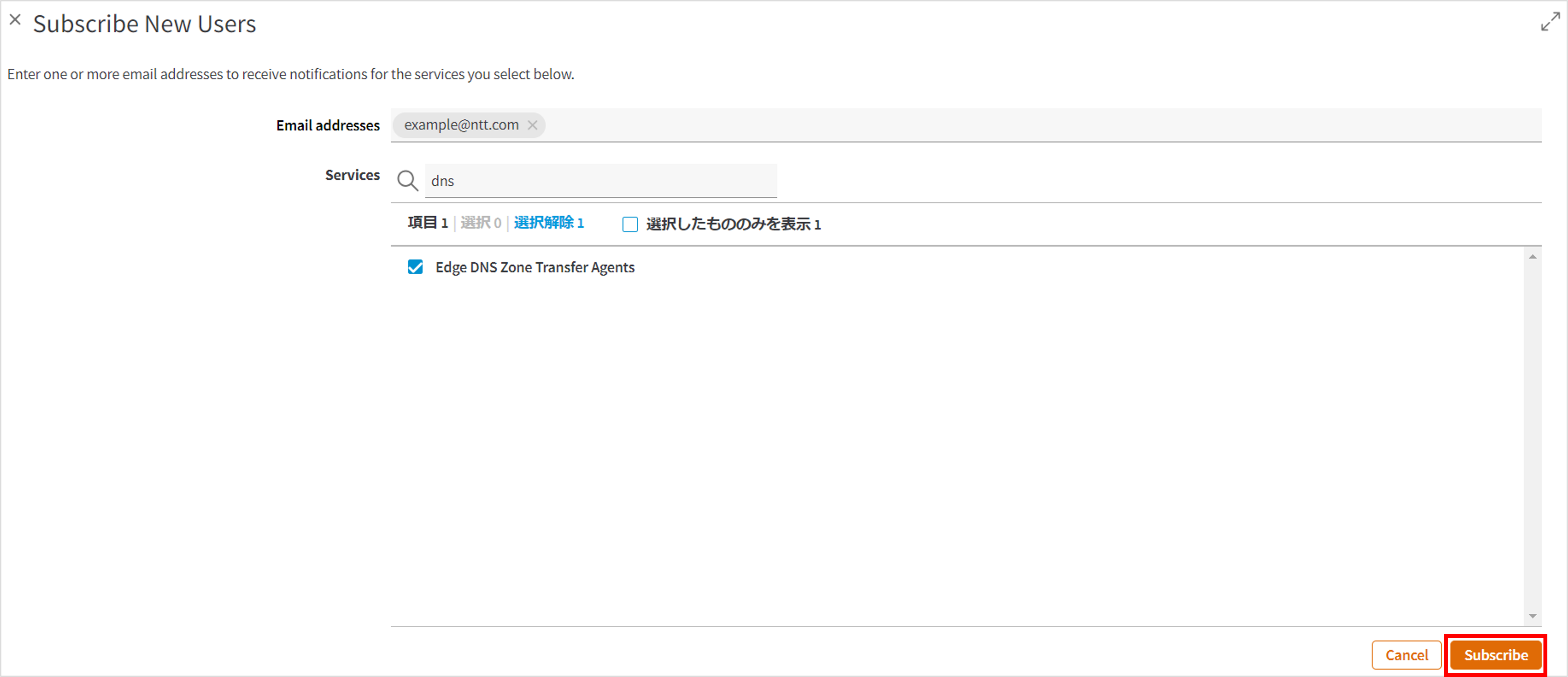 対象サービスの選択画面が表示されます。Eメールアドレスに通知先メールアドレス、サービスに「dns」と入力し、「Edge DNS Zone Transfer Agents」を選択して「Subscribe」をクリックします。