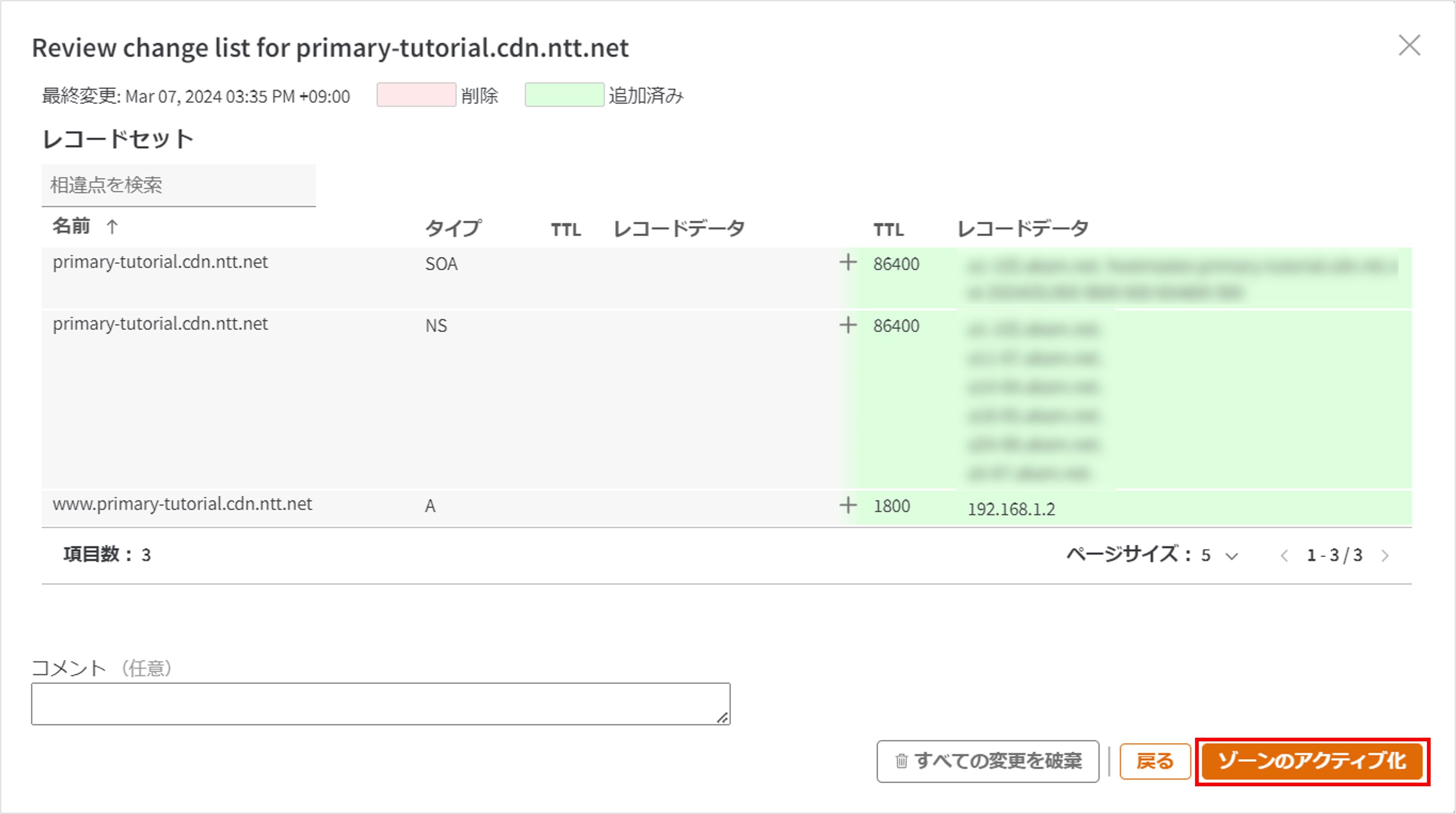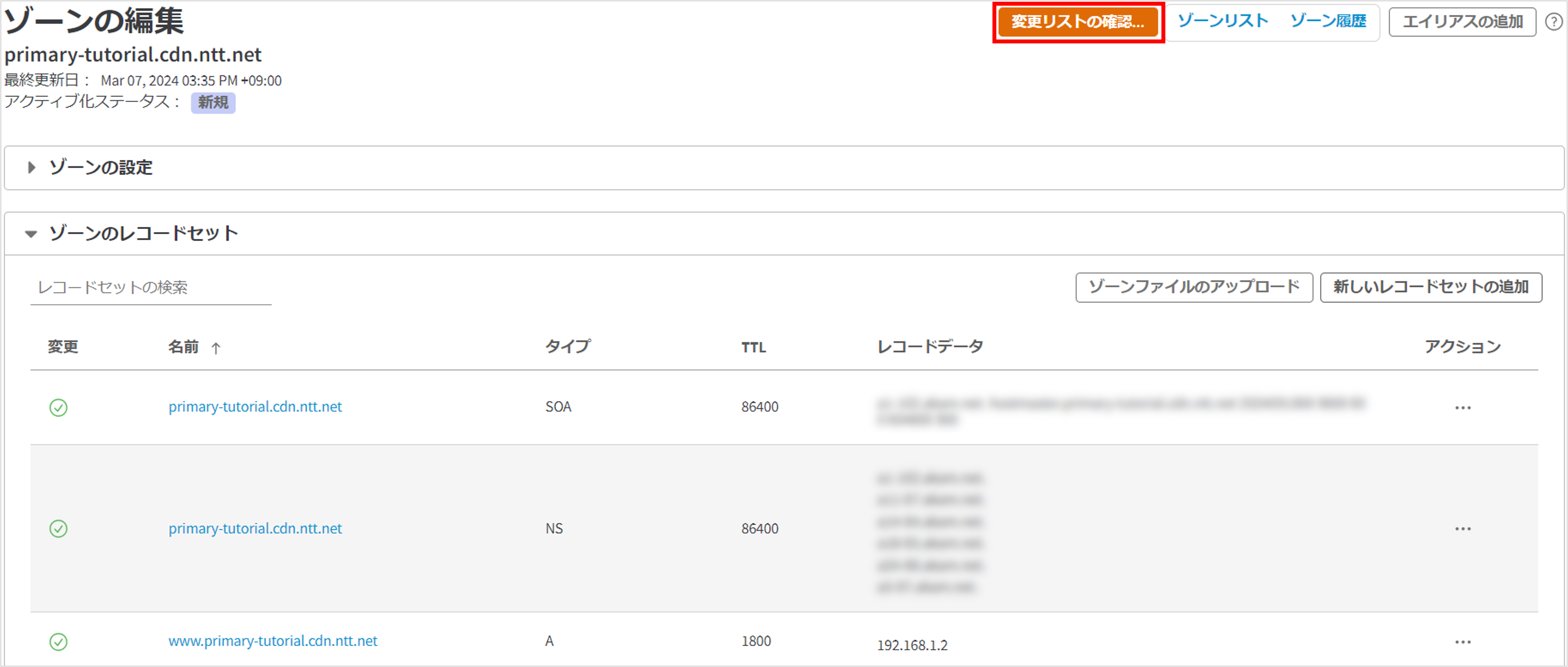 レコード設定の一覧画面が表示されます。「変更リストの確認…」をクリックします。