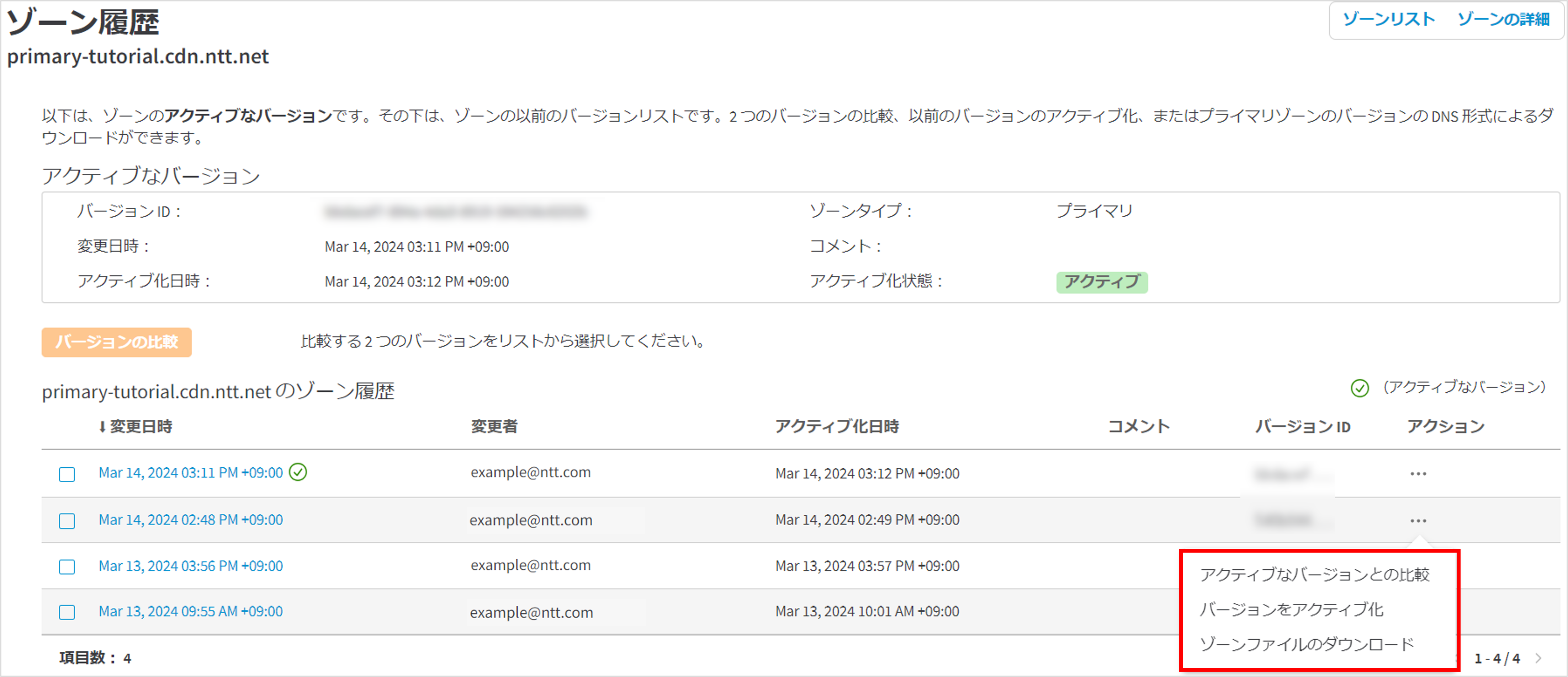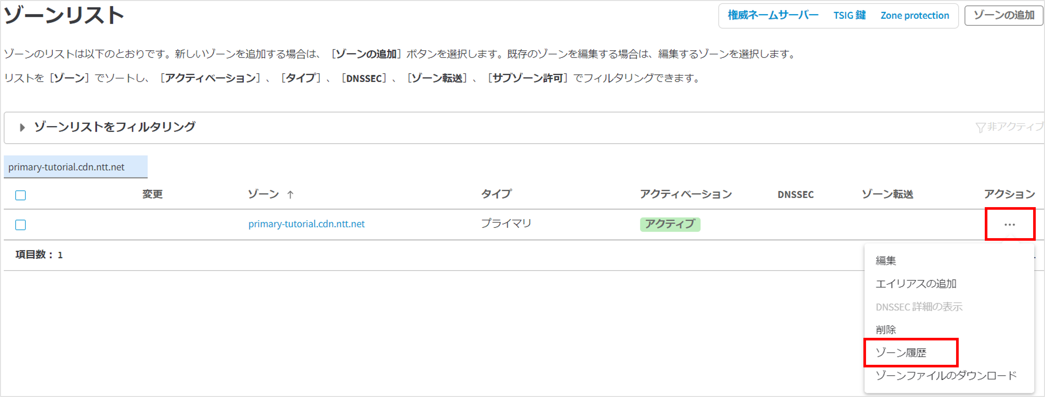 EdgeDNS設定一覧画面が表示されます。対象ゾーンの「アクション」から「ゾーン履歴」をクリックします。