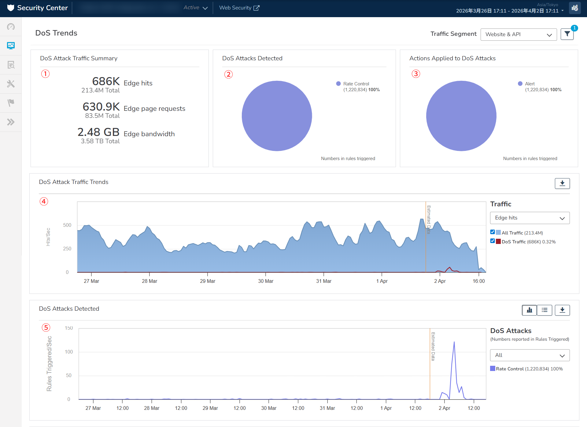 上から、DoSとして検知されたエッジヒット数、DoSとして検知されたページリクエスト数、DoSとして検知されたトラフィックの帯域、になります。