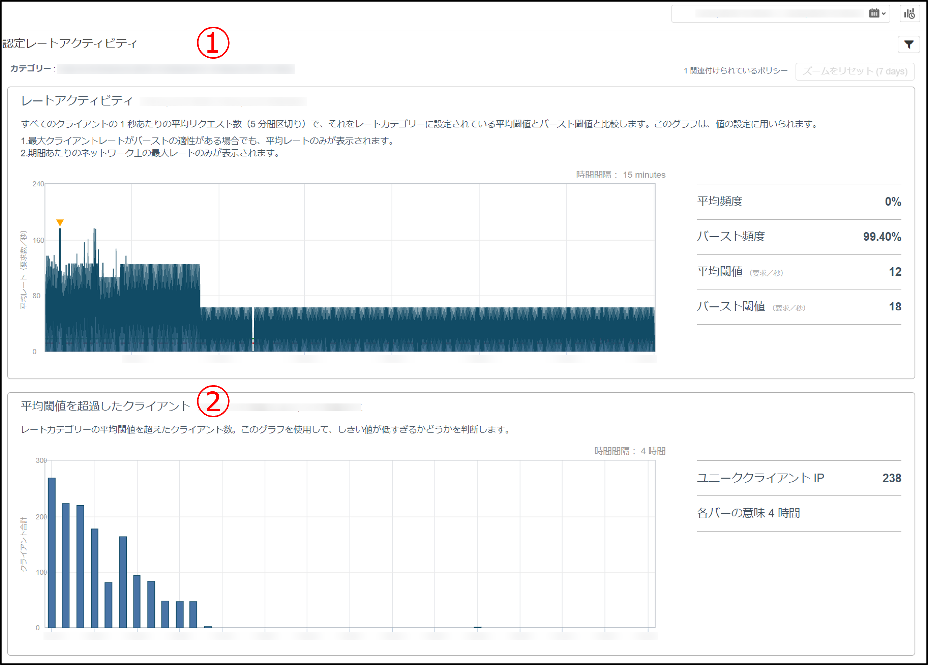 平均リクエスト数は5分平均で表記され、右に記載されているレートポリシーの現行閾値設定と比較できます。