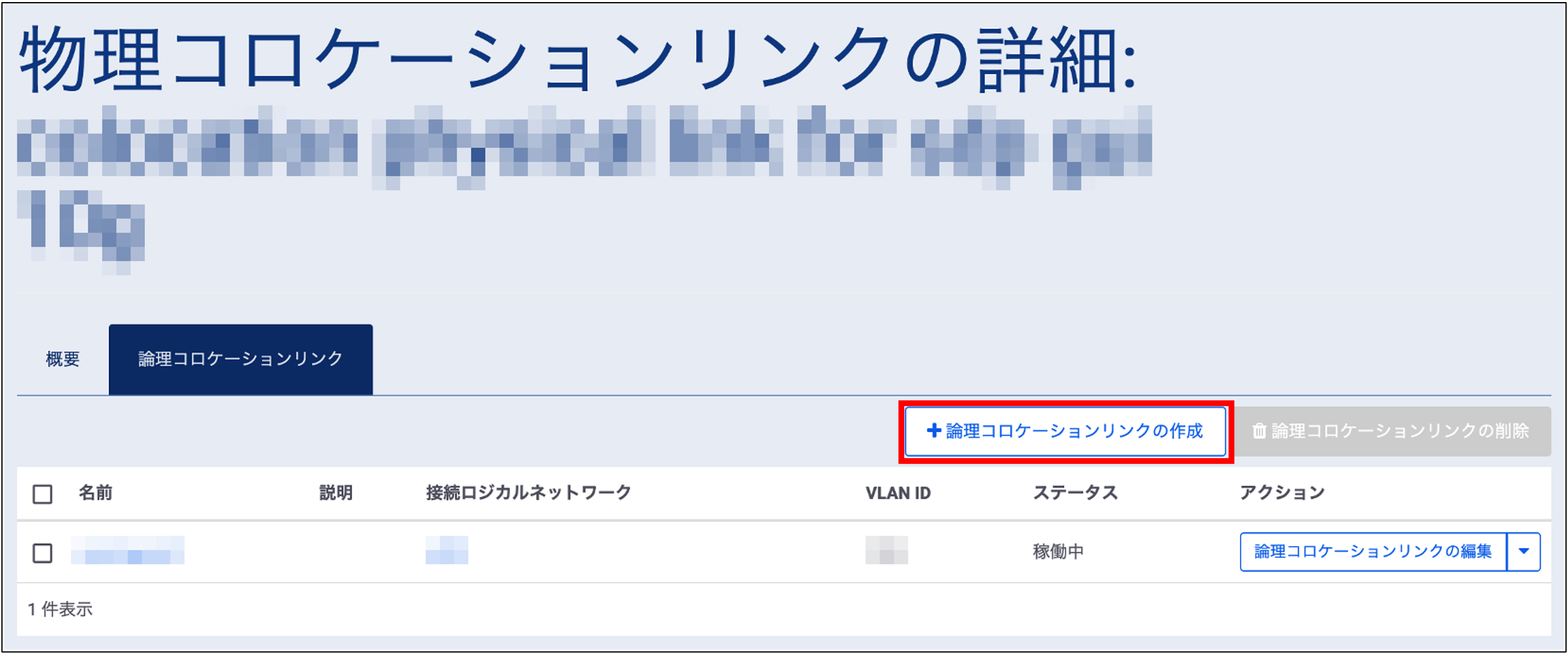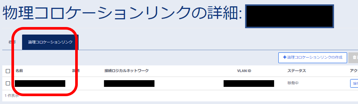 表示されている「名前」をクリックし、「物理コロケーションリンクの詳細」を表示します。 新しく作成する場合は、「論理コロケーションリンクの作成」をクリックします。