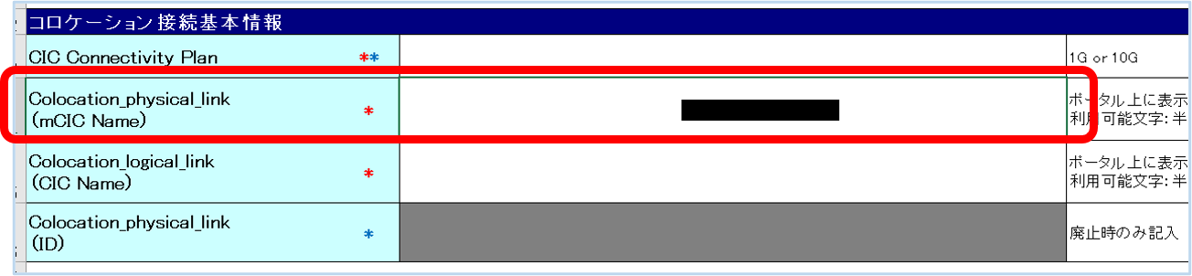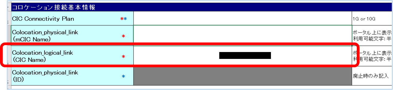 ②申込書の「Colocation_logical_link(CIC Name)」に記載された内容は、SDPFポータル画面の[論理コロケーションリンク]欄の「名前」に表記されます。 なお、本記載はCIC開通試験時に利用します。CIC開通後はお客様にて変更可能です。
