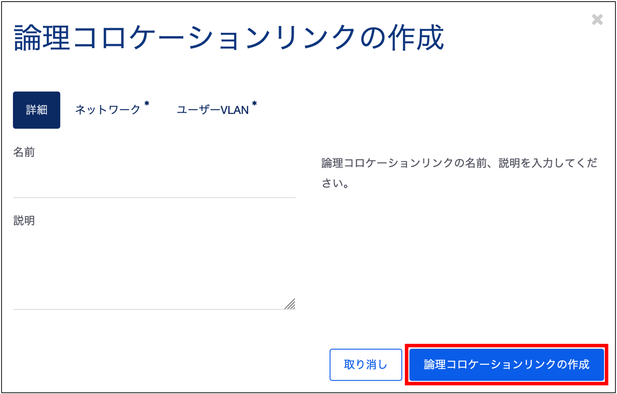 「論理コロケーションリンクの作成」画面では、「名前:ロジカルネットワーク:VLANID」を入力し、「論理コロケーションリンクの作成」をクリックすることで、新しい論理コロケーションリンクが作成されます。