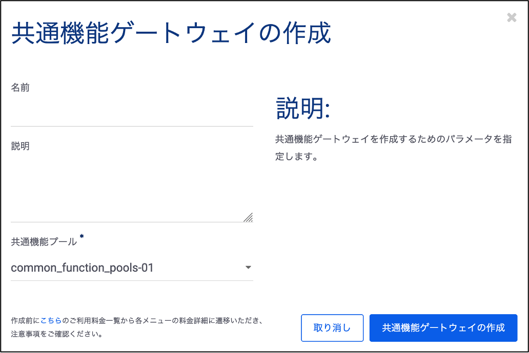 コントロールパネルにログインし、「クラウド/サーバー ローカルネットワーク」→「共通機能ゲートウェイ」へと進みます。画面遷移後、「共通機能ゲートウェイの作成」を選択し、お客様側での管理上の名前、接続する共通機能プールを選択します。