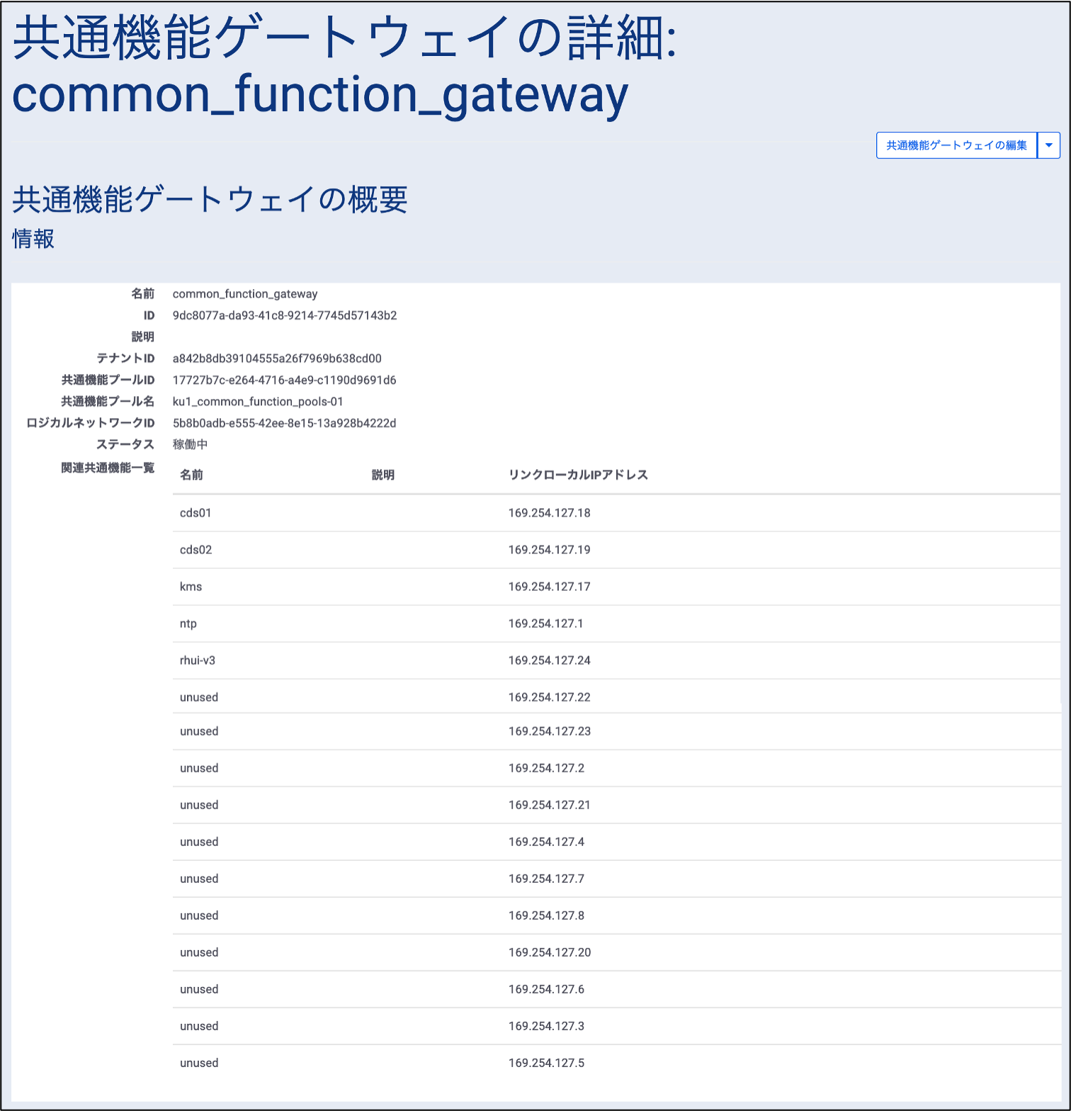 作成が完了したあと、今回作成した共通機能ゲートウェイの名前を選択することで、下記のような詳細画面が表示されます。Smart Data Platform で提供する共通機能、ライセンス認証サーバーやNTPサーバーへの接続には、リンクローカルアドレスを使った通信を行います。
