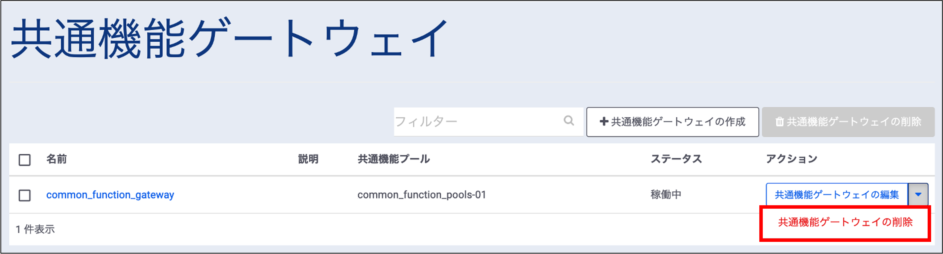 コントロールパネルにログインし、「クラウド/サーバー ローカルネットワーク」→「共通機能ゲートウェイ」へと進みます。画面遷移後、対象の共通機能ゲートウェイの「共通機能ゲートウェイの削除」を選択します。