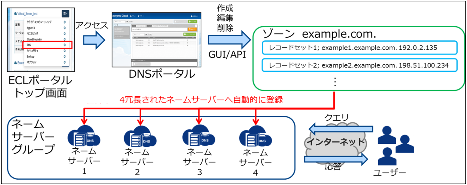 本メニューでは4冗長されたネームサーバー群をネームサーバーグループとし、ゾーンを作成すると作成されたゾーンはいずれかのネームサーバーグループに割り当てられます。 ゾーンで作成したレコードセットは、ゾーンに割り当てられたネームサーバーグループ内にある4つのネームサーバーに自動的に登録されます。