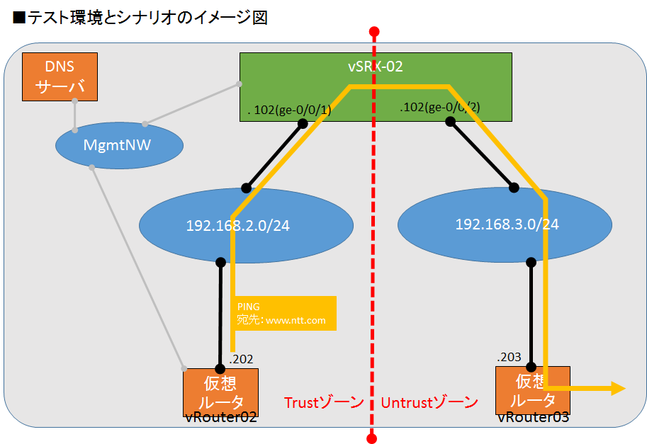 TrustゾーンのサーバーインスタンスがUntrustゾーンの仮想ルーターを経由してインターネットと通信するネットワーク構成です。