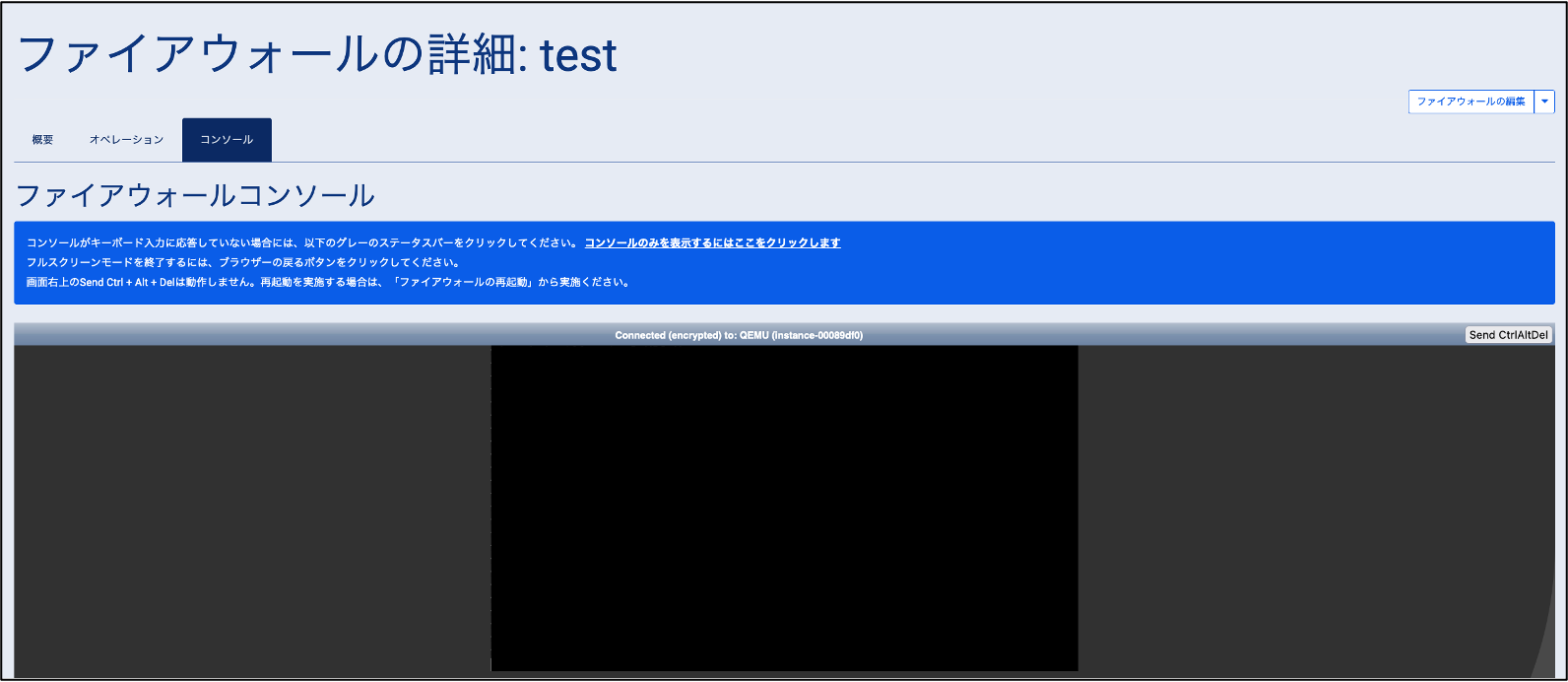画面右上のSend Ctrl + Alt + Delは動作しません。再起動を実施する場合は、「ファイアウォールの再起動」から実施してください。