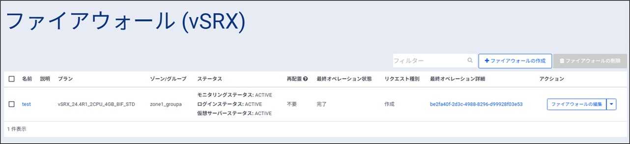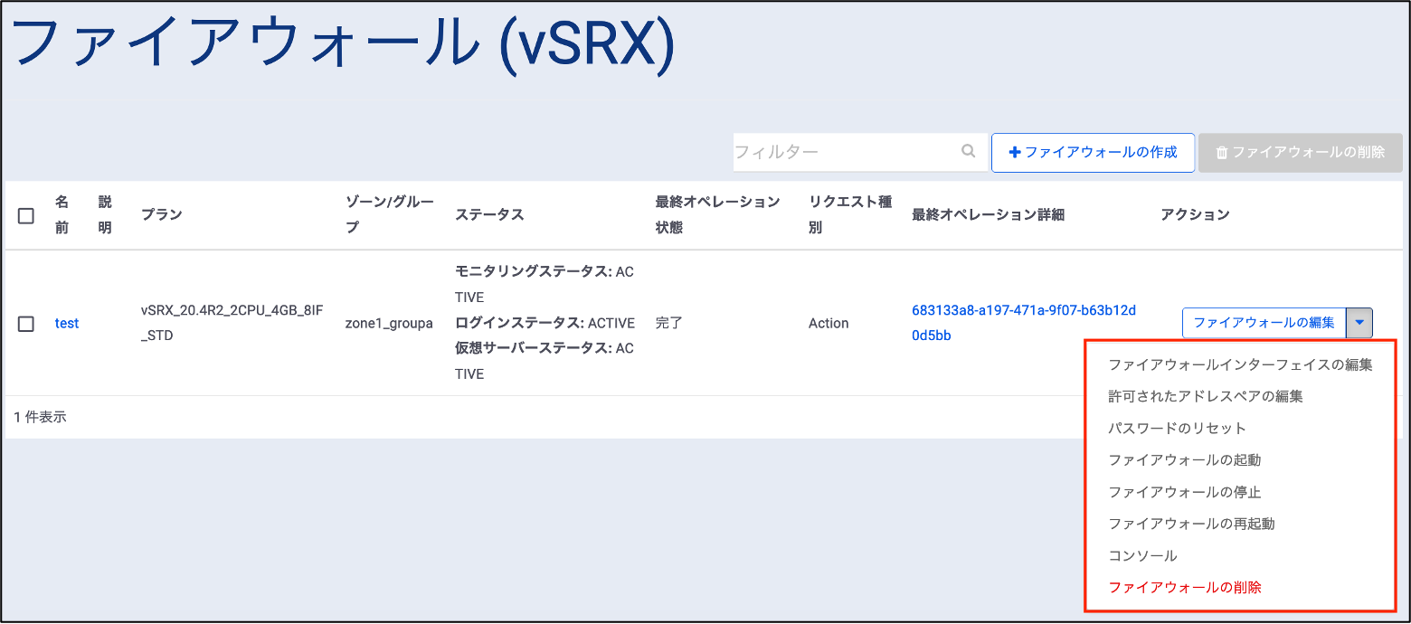ファイアウォール(vSRX)に対して行った操作のステータスについて参照できます。 |