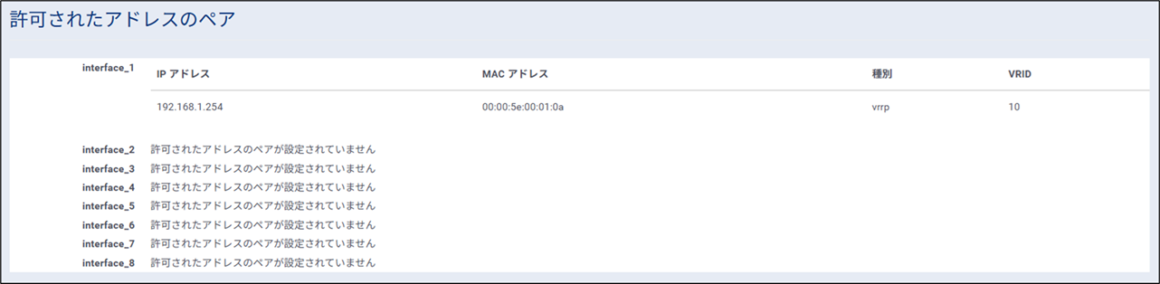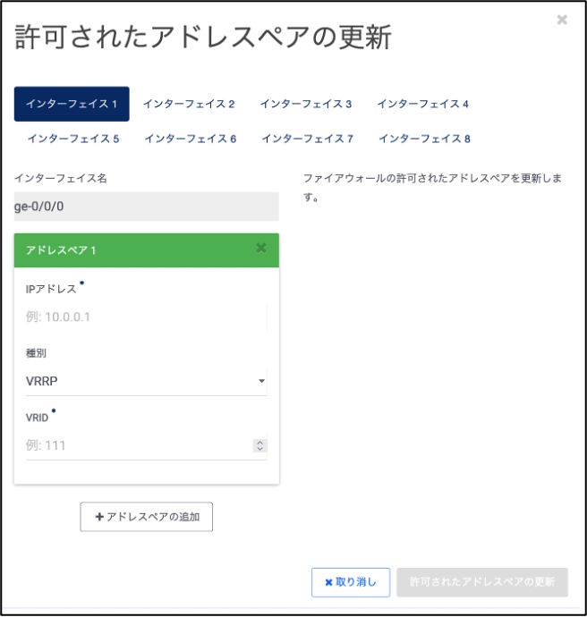 インターフェイスに割り当てる許可されたアドレスのペアの種別を「VRRP」に指定してください。 |