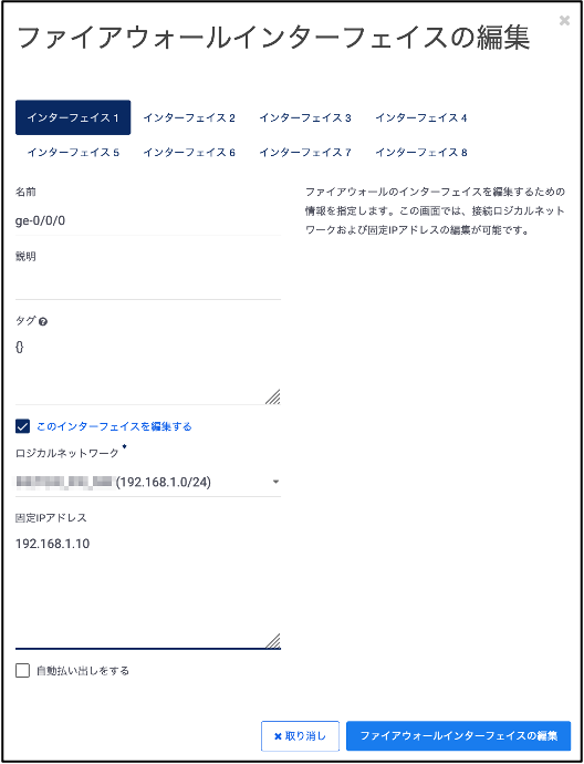 ファイアウォールの接続先ロジカルネットワークや固定IPアドレスを編集できます。 |