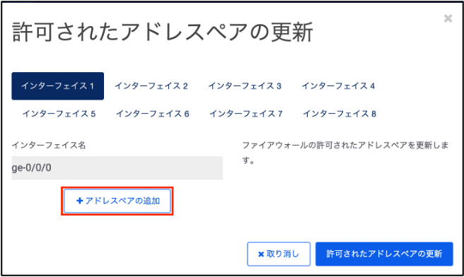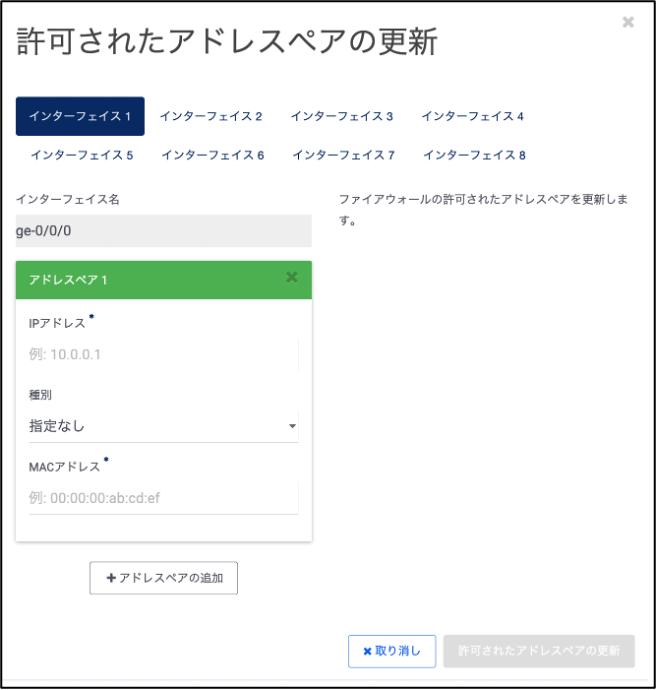 ファイアウォールのインターフェイスに割り当てる許可されたアドレスのペアを編集できます。 |