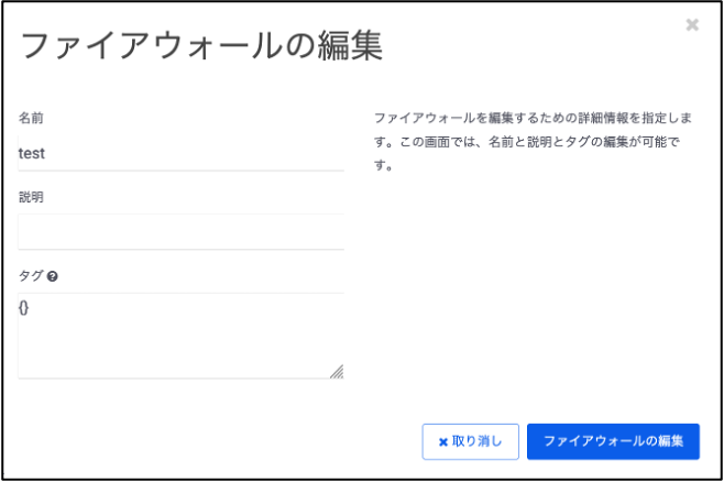 編集したいファイアウォールの編集画面を開き、ファイアウォールの名前と説明を指定します。