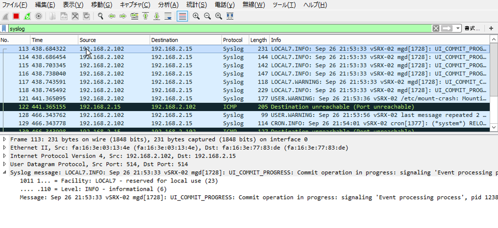 以下のパケットキャプチャデータからSyslogサーバー(192.168.2.15)にSyslogが送出されていることが確認できます。