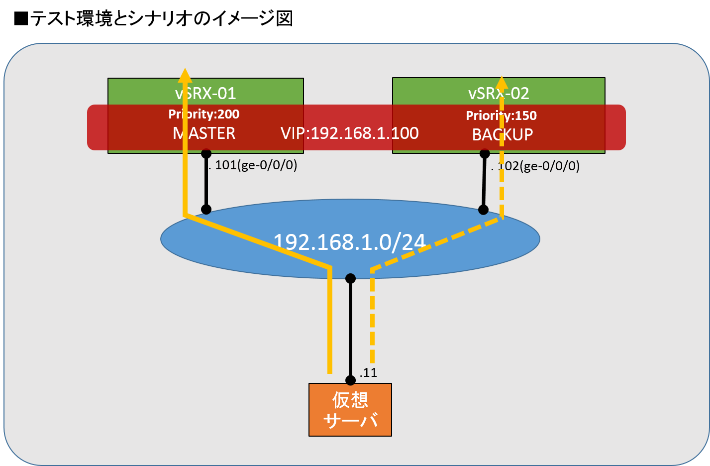 ファイアウォール(vSRX) では、VRRP機能を使ってネットワークの冗長化設定が可能です。