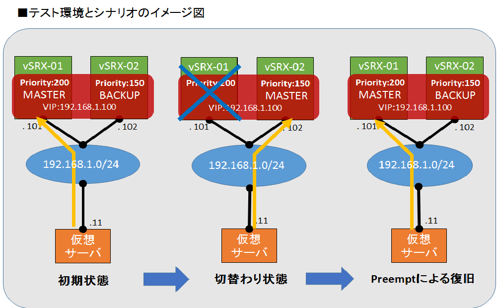 MASTER側が障害や通信できない状況であることを擬似してvSRX-01を一度切断し、vSRX-02だけが通信可能な環境をつくります。(図の中央の状態)この状態からvSRX-01を接続させた場合に、Priority値に従ってvSRX-01がMASTER、vSRX-02がBACKUPに状態が変更されるようになります。(図の右側の状態)