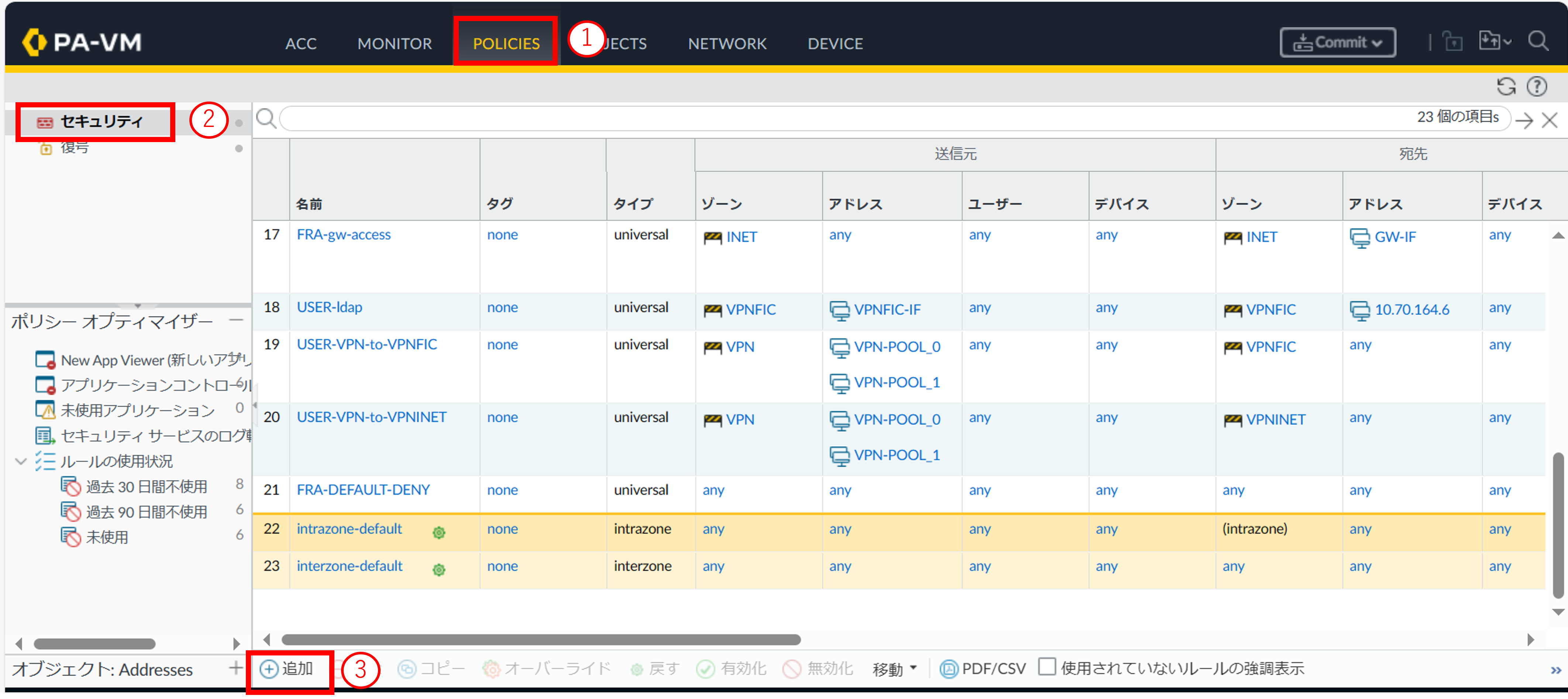 - ①[Policies]をクリックします。②[セキュリティ]をクリックします。③[追加]をクリックします。クリックすると新規ポリシー画面が表示されます。
