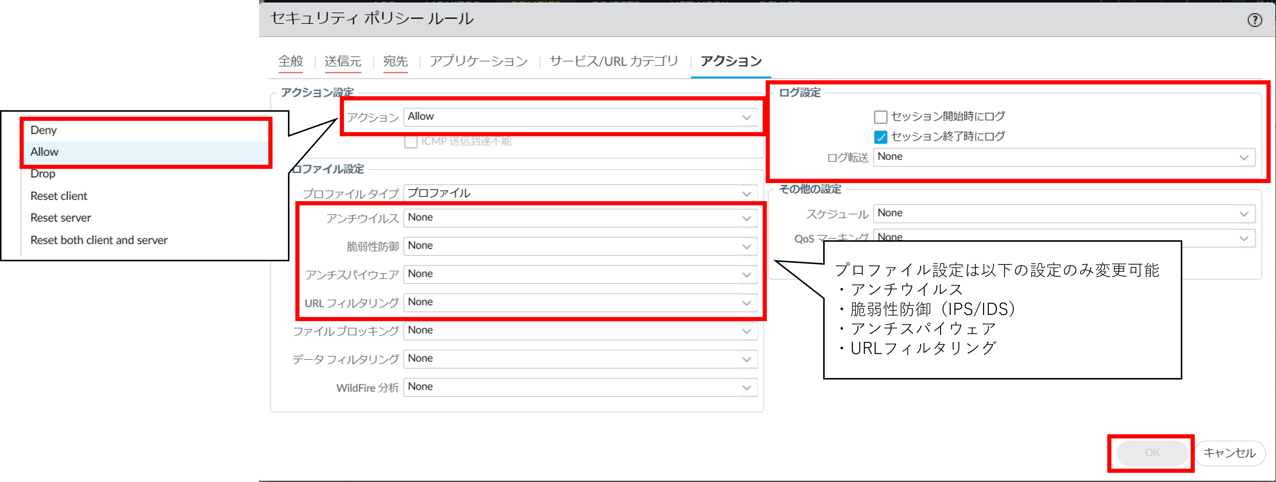 図2.8.7.3.6. セキュリティポリシールール(アクション)¶