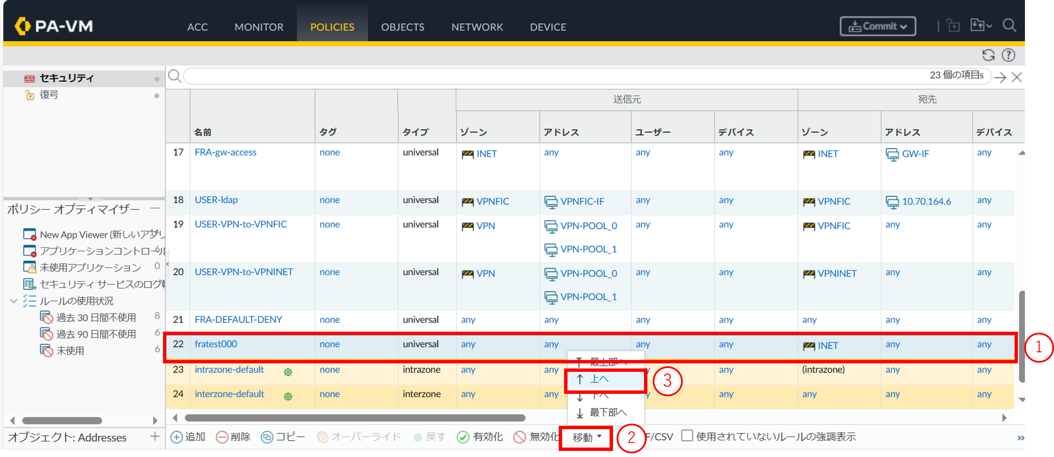 - ①追加したポリシーを選択します。②[移動]をクリックします。③[上へ]をクリックし、変更可能なルールの間または直上直下に移動します。