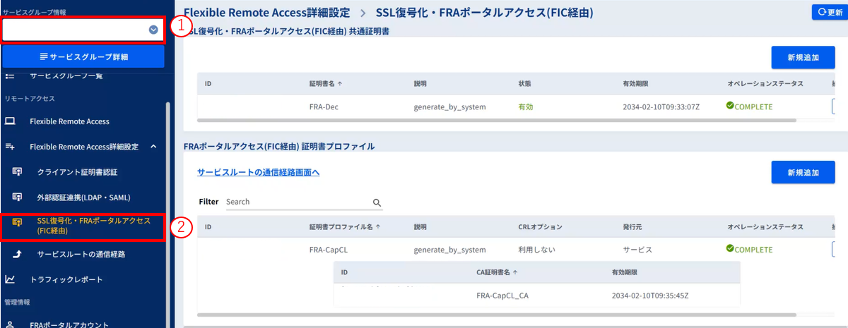 - ①左メニューの「サービスグループ情報」からFIC経由でFRAポータルにアクセスするサービスグループを選択します。②[SSL復号化・FRAポータルアクセス(FIC経由)]をクリックします。