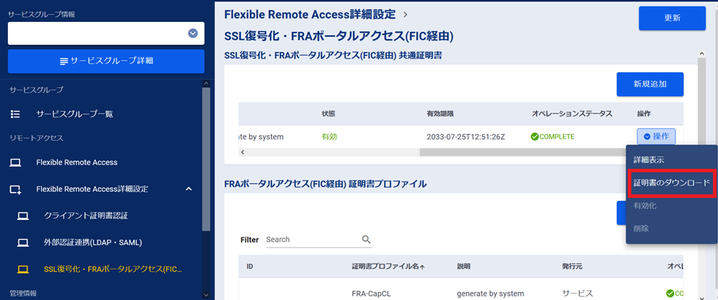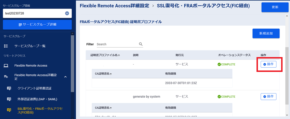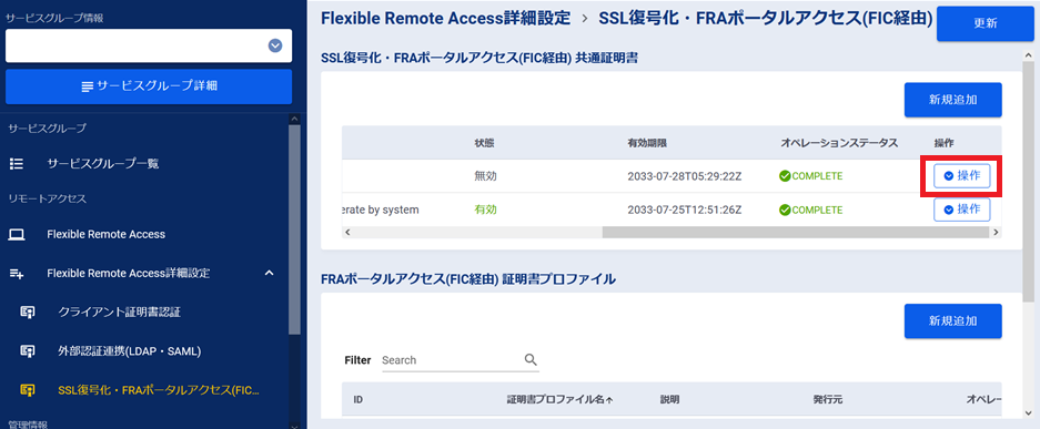対象の「FRAポータルアクセス(FIC経由) 証明書プロファイル」の[操作]ボタンを押下します。