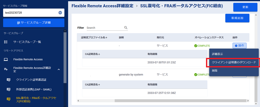 対象の「SSL復号化・FRAポータルアクセス(FIC経由)共通証明書」の[操作]ボタンを押下します。
