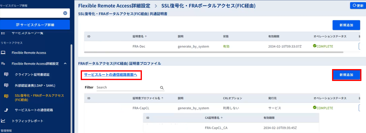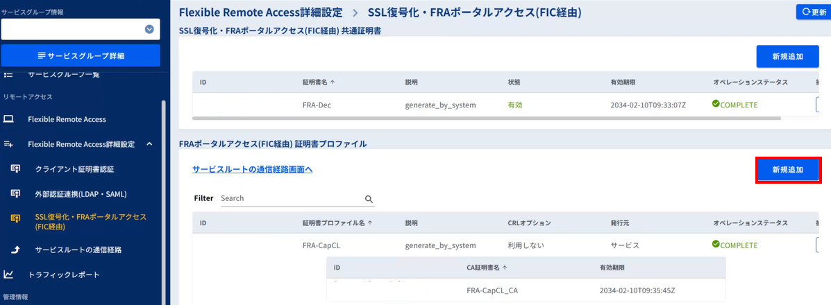 「FRAポータルアクセス(FIC経由)証明書プロファイル」の[新規追加]ボタンを押下します。