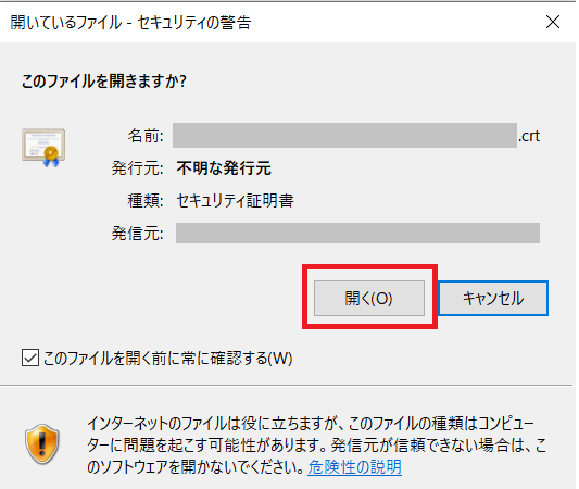 ダウンロードしたSSL復号化・FRAポータルアクセス(FIC経由)共通証明書をダブルクリックします。