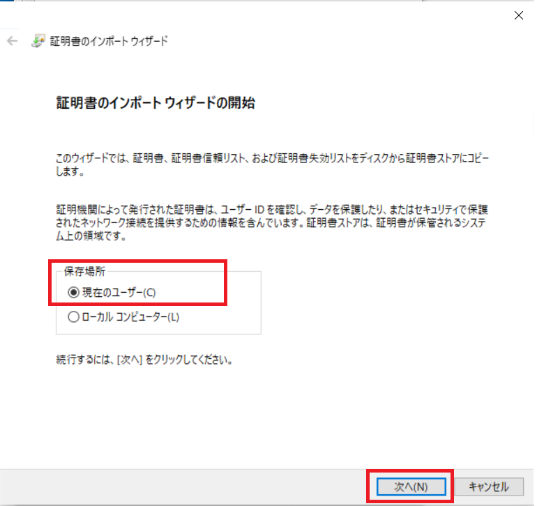 現在のユーザーにチェックをし、[次へ]ボタンを押下します。