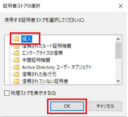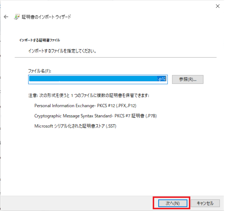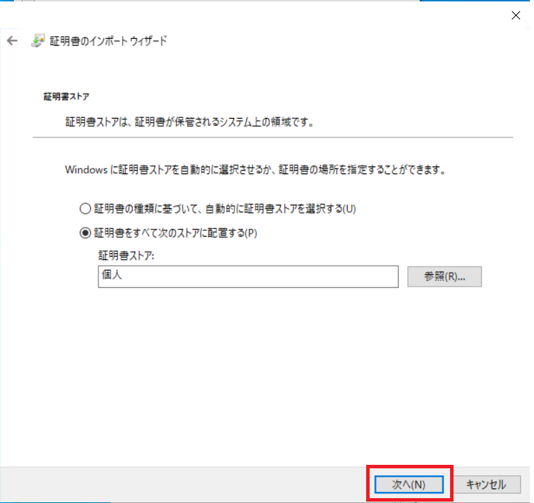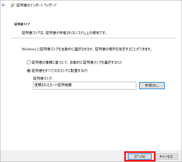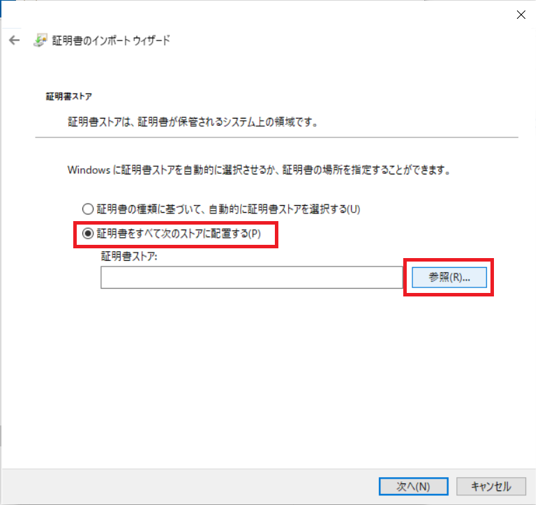 証明書をすべて次のストアに配置する(P)にチェックをし、[参照]ボタンを押下します。