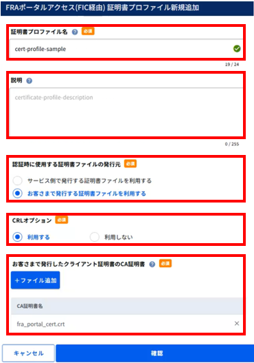 追加する証明書プロファイルの名前を入力してください。FRAポータルの設定時に本証明書プロファイル名を選択します。