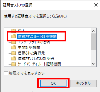信頼されたルート証明機関を選択し[OK]ボタンを押下します。