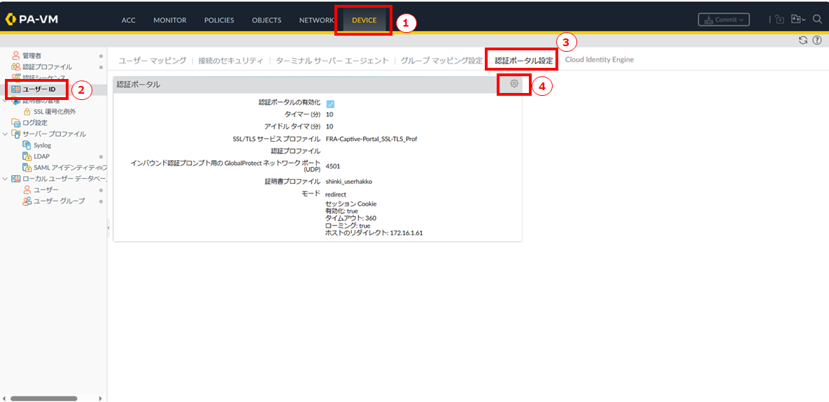 - ① Deviceタブをクリックします。② ユーザーIDをクリックします。③ キャプティブポータルの設定タブをクリックします。④ 編集アイコンをクリックします。
