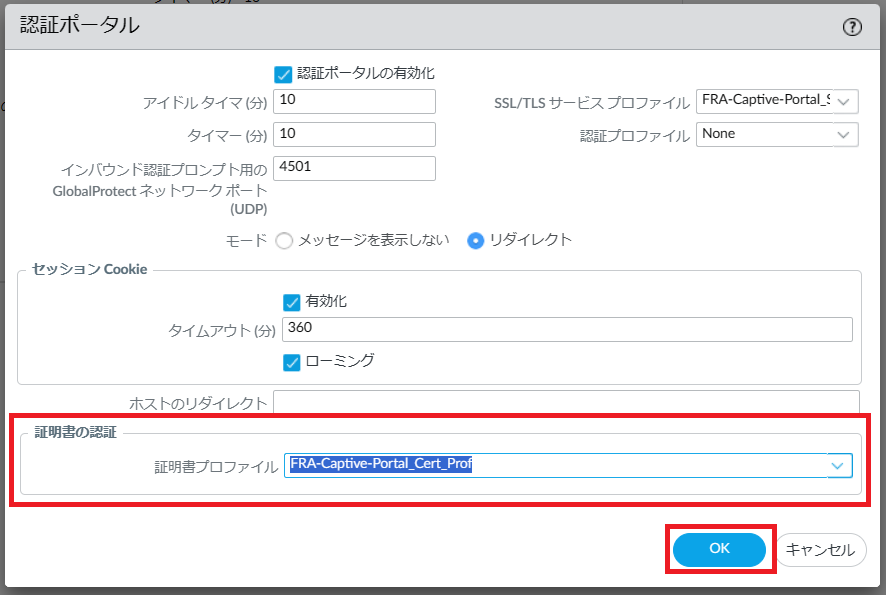 証明書の認証の証明書プロファイルの設定で、Fsecコンソールで追加した証明書プロファイルを選択し[OK]ボタンを押下します。