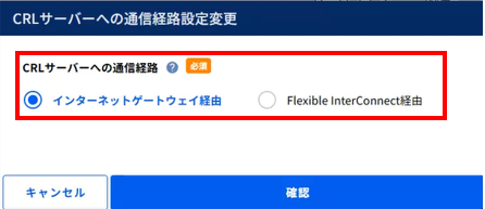 CRLサーバーへの通信経路を「インターネットゲートウェイ経由」、または「Flexible InterConnect経由」から選択します。