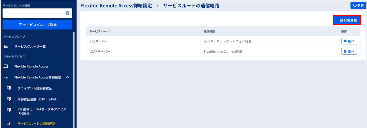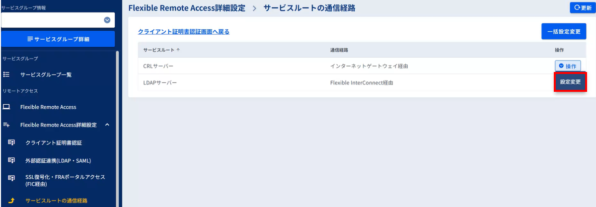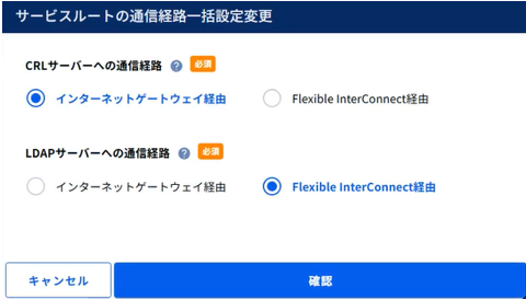 - サービスルートの通信経路画面では、LDAPサーバーの通信経路とCRLサーバーの通信経路を一括で変更することも可能です。[一括設定変更]ボタンを押下し、それぞれの設定変更内容を入力します。
