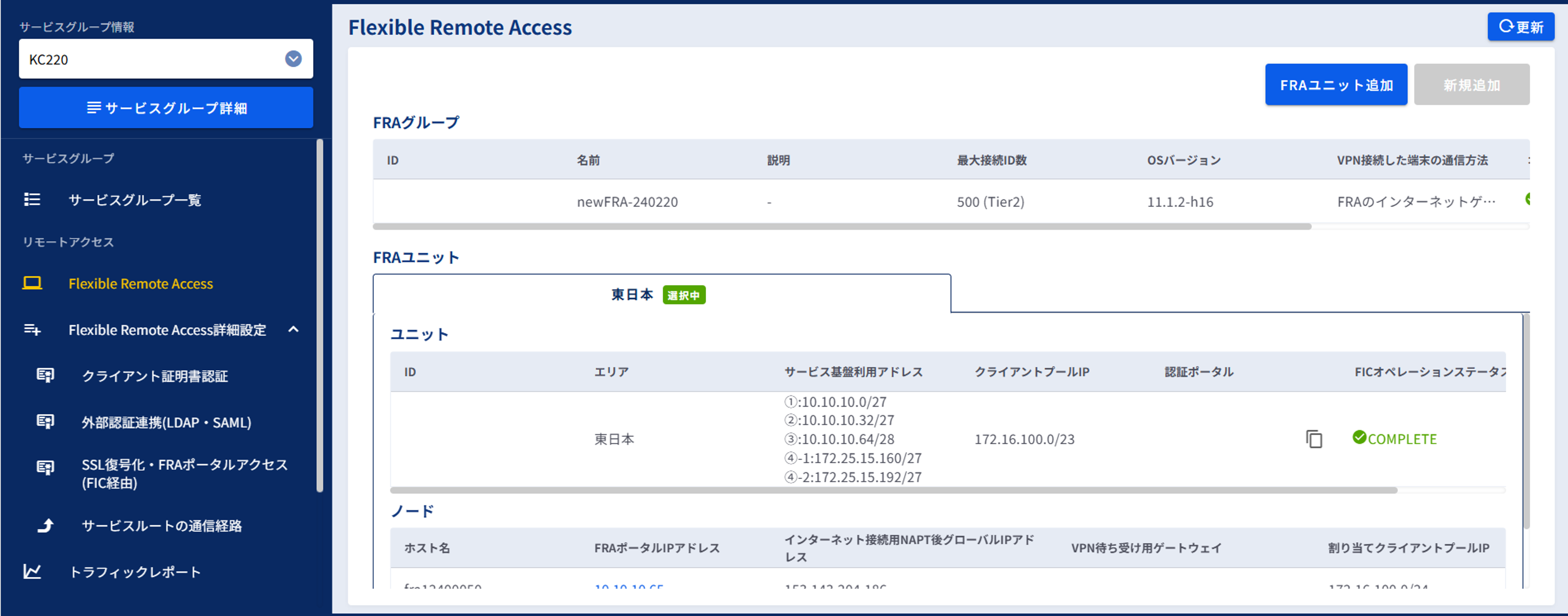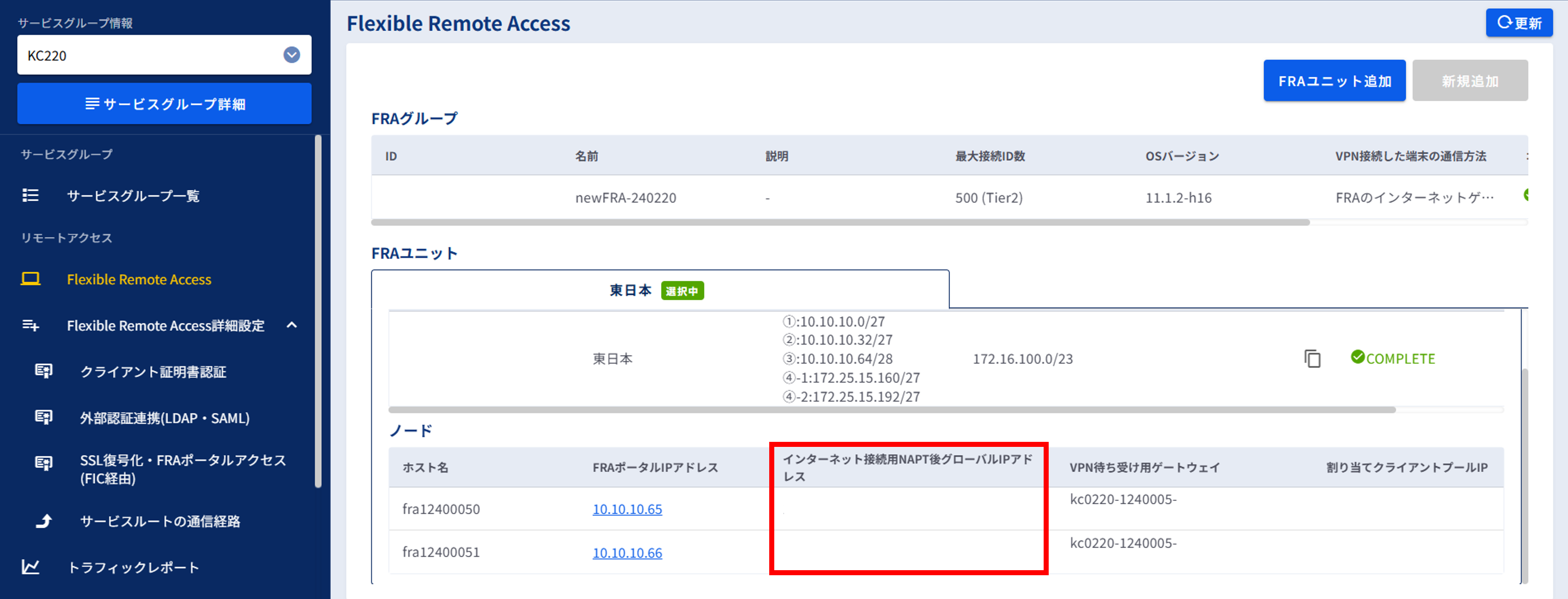 「Flexible Remote Access」画面でFRAグループが変更されたことを確認します。