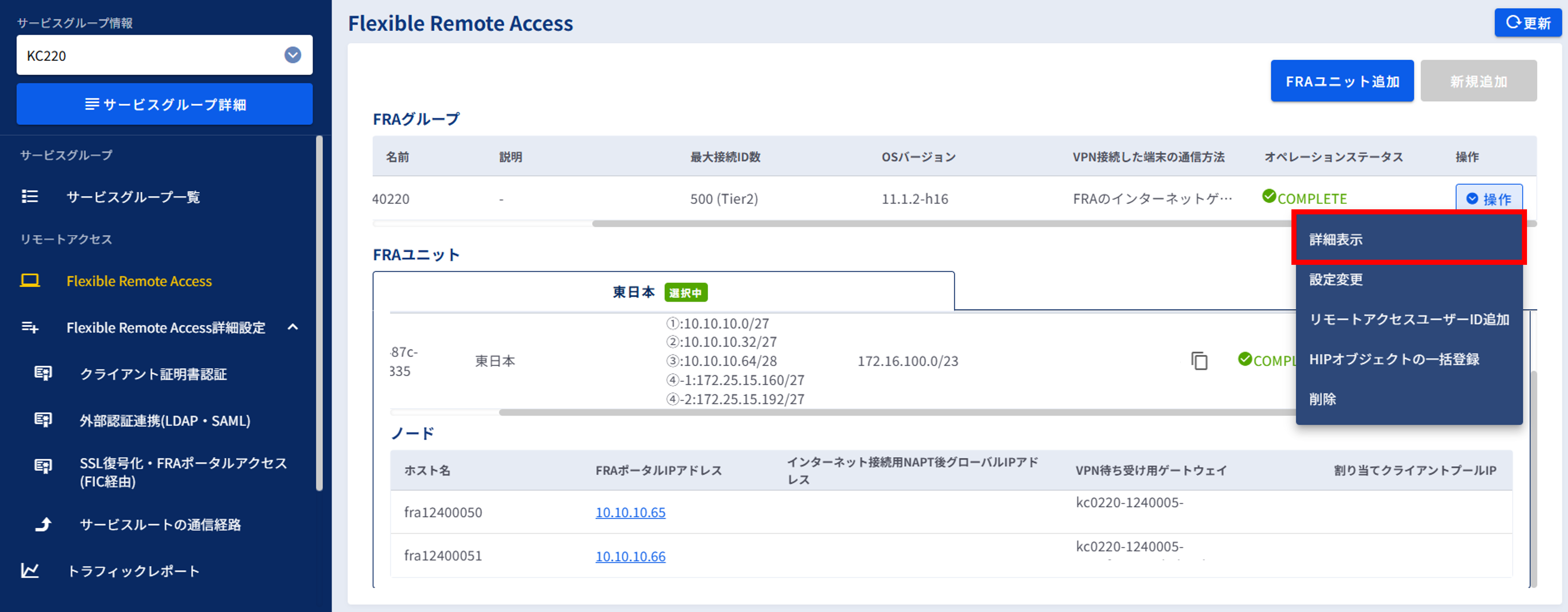 FRAグループの[操作]プルダウンメニューから[詳細表示]をクリックし、帯域確保オプション(区間①)の帯域が変更されたことを確認します。