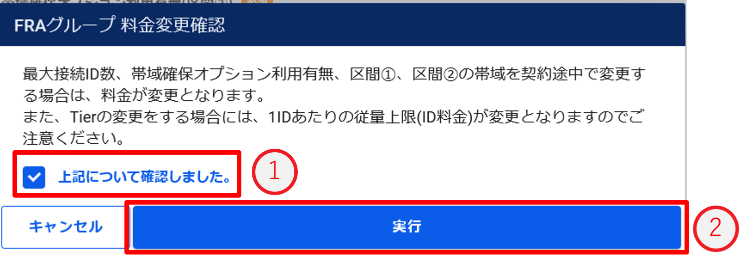 - ➀料金変更確認を読み、[上記について確認しました。]にチェックを入れます。➁[実行]ボタンを押下します。