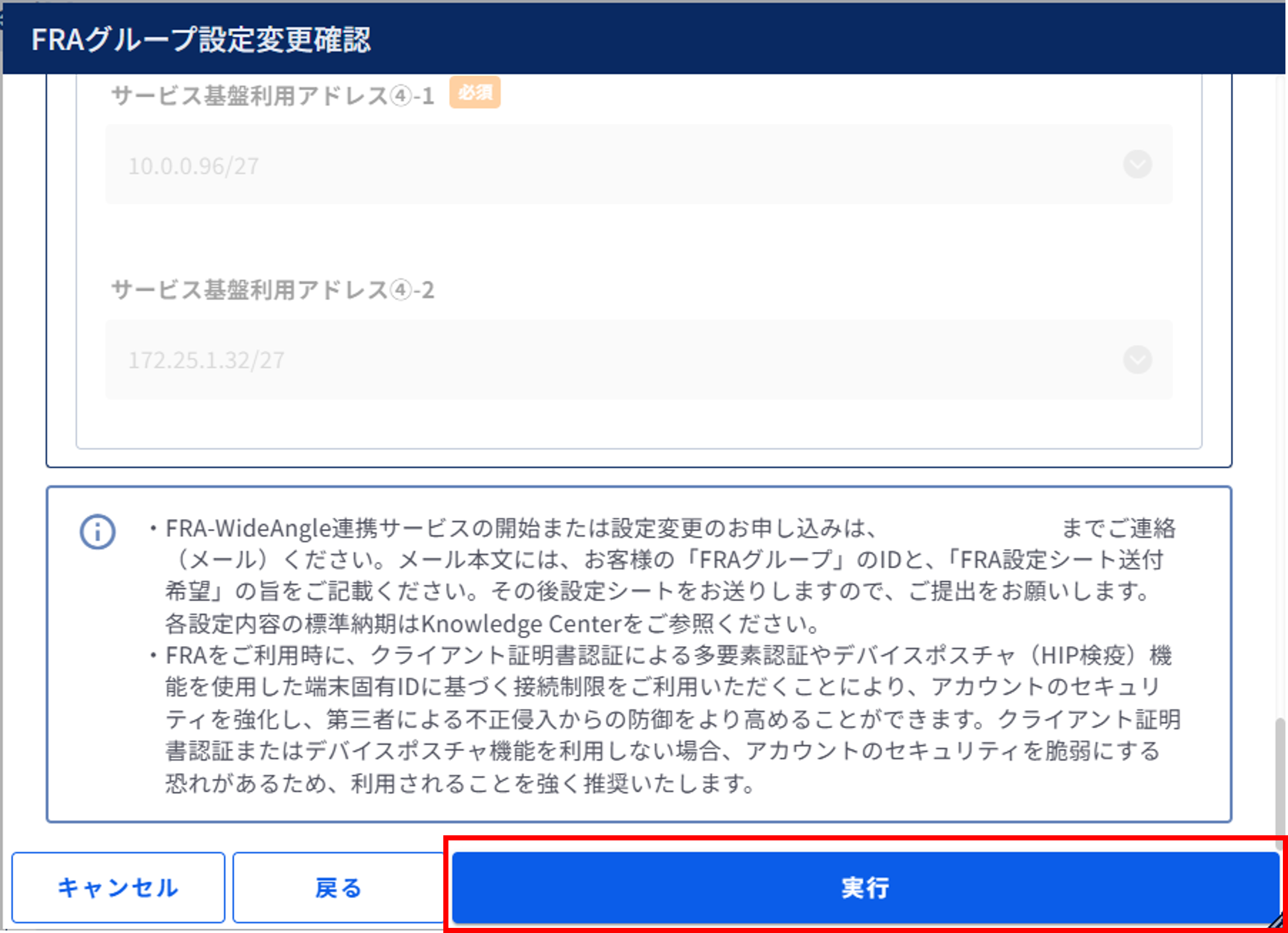 区間①の帯域を増速する際に、認証ポータルおよびVPN待ち受け用ゲートウェイに割り当てられているグローバルIPアドレスの変更を許容する場合は「許容する」を選択してください。「許容しない」を選択した場合、設備の収容状況によっては増速に失敗する可能性がございます。「許容する」を選択した場合でかつ増速するための設備の空きが無い場合に限り、別の設備へ移行後に帯域を増速します。 |