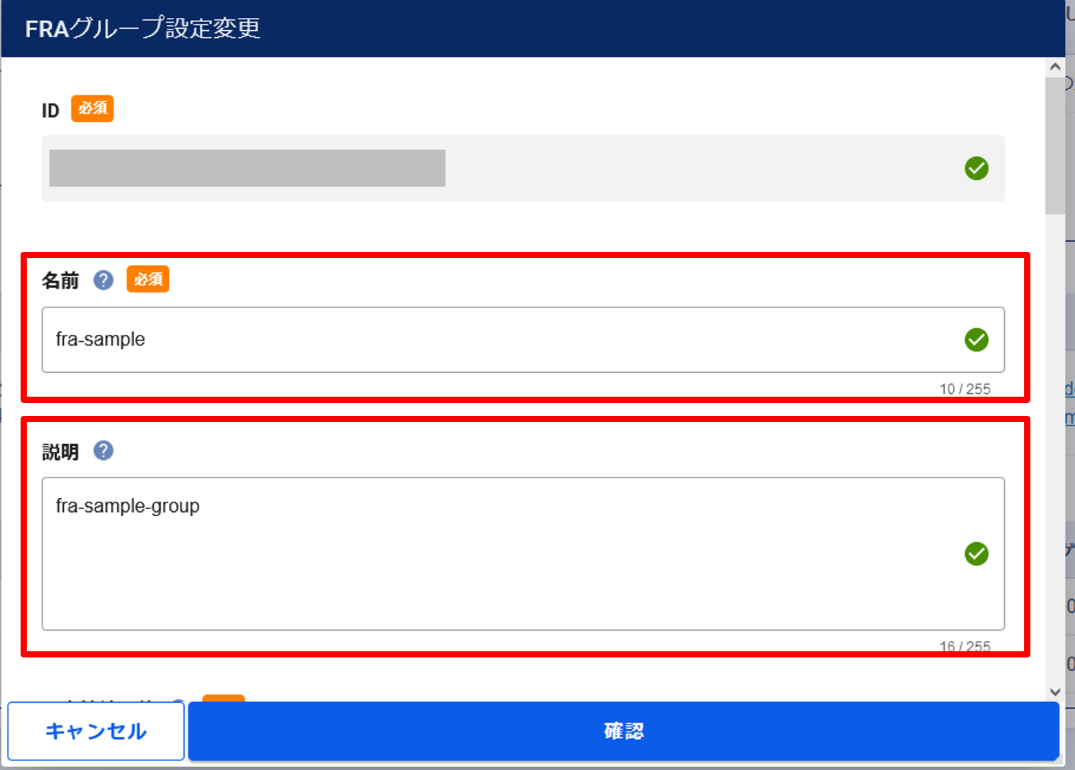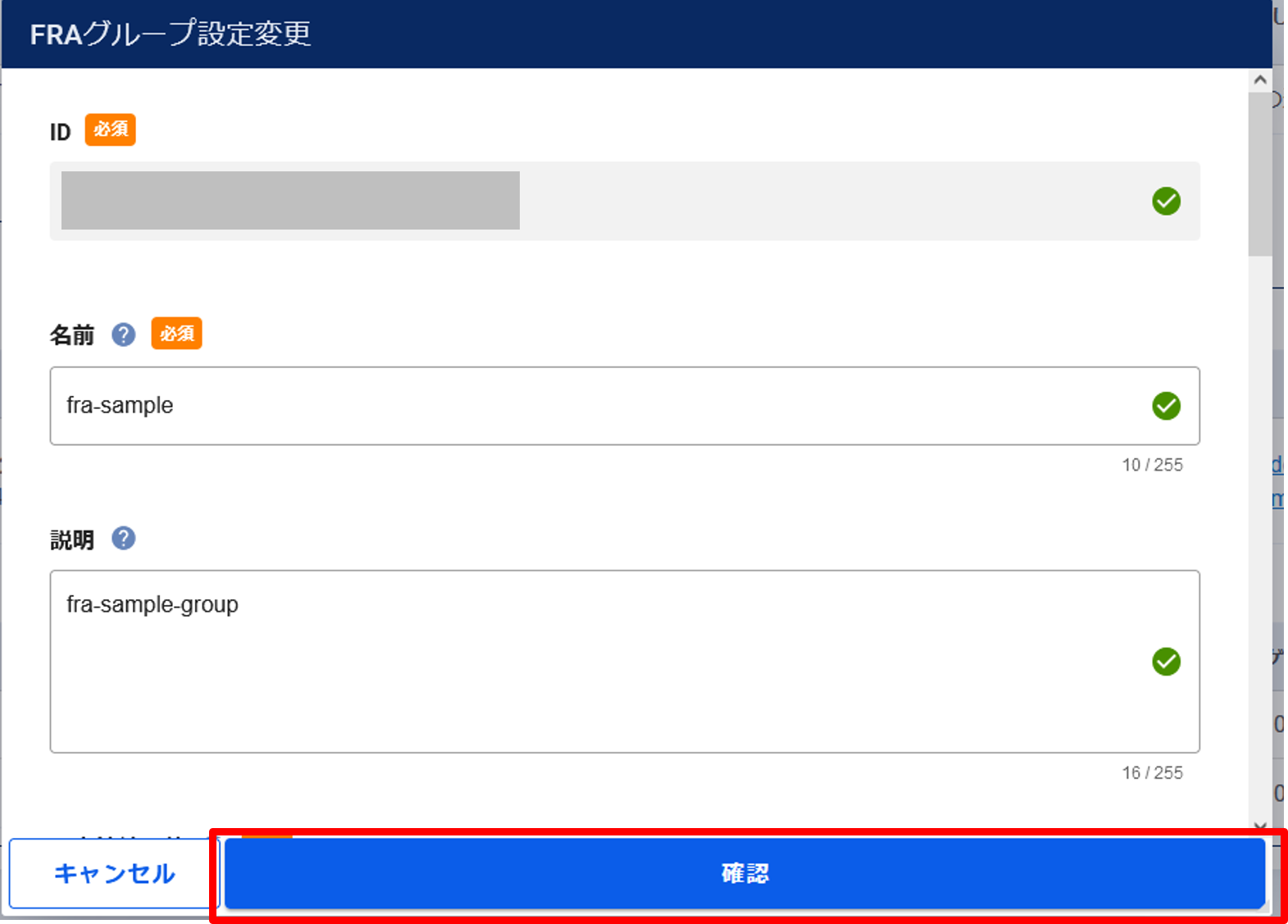 「FRAグループ」画面で変更する対象の[操作]プルダウンメニューより[設定変更]ボタンを押下します。