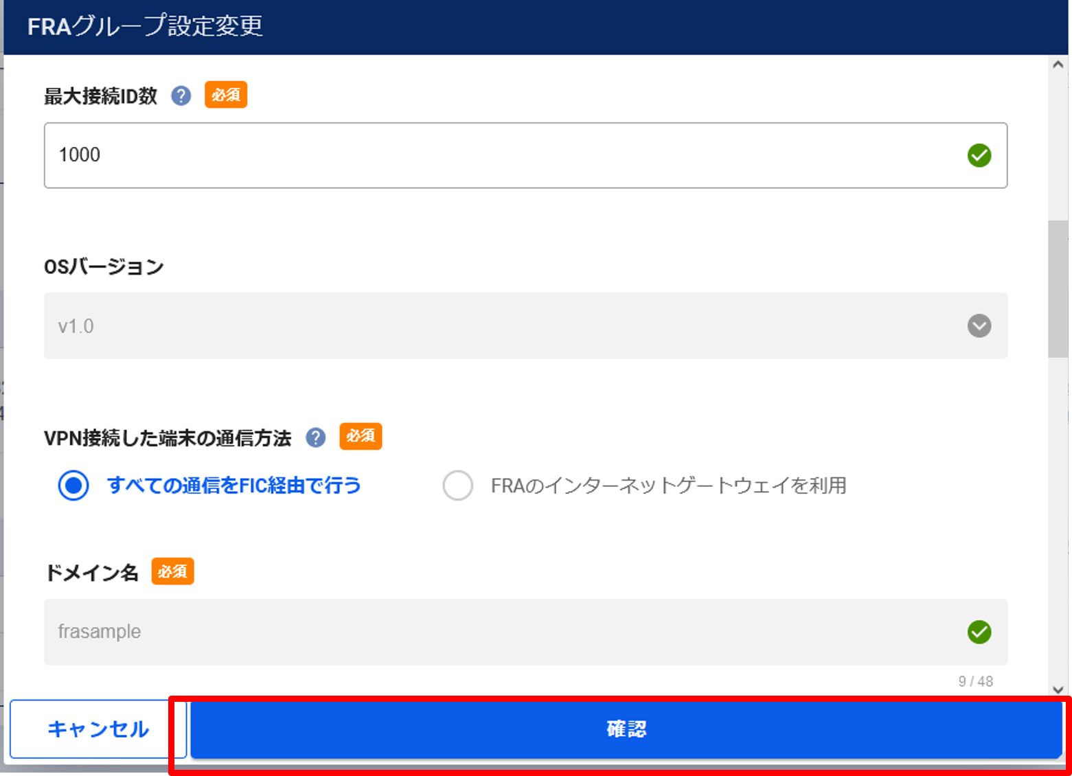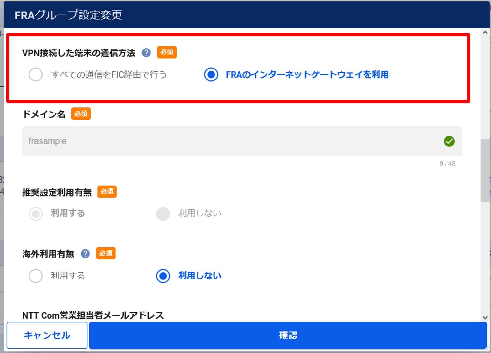 VPN接続した端末の通信方法の箇所で[すべての通信をFIC経由で行う]または[FRAのインターネットゲートウェイを利用]のいずれか選択します。