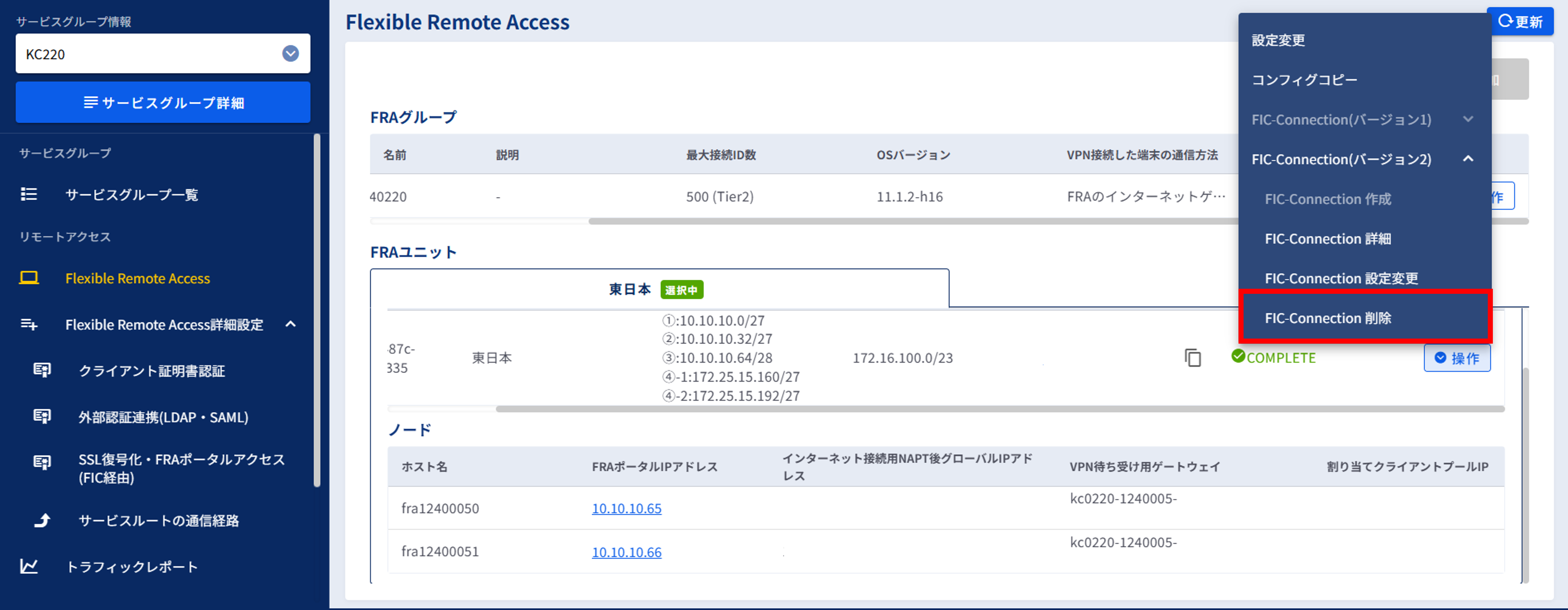 「FRAユニット」画面で削除するFIC-Connectionの[操作]プルダウンメニューより、[FIC-Connection削除]をクリックします。