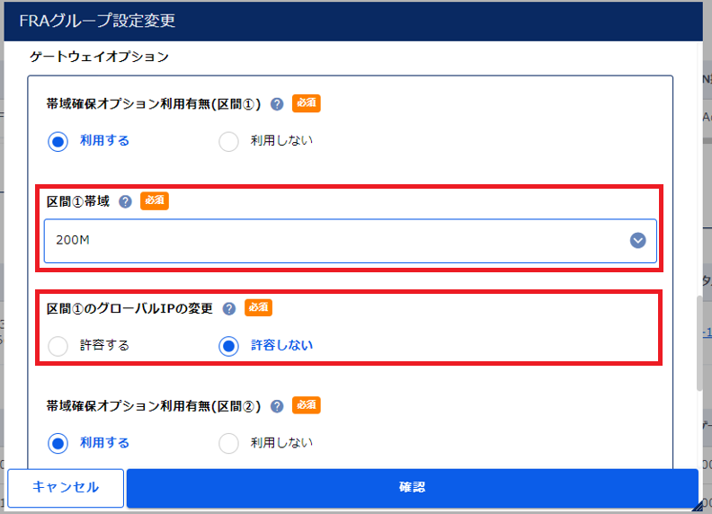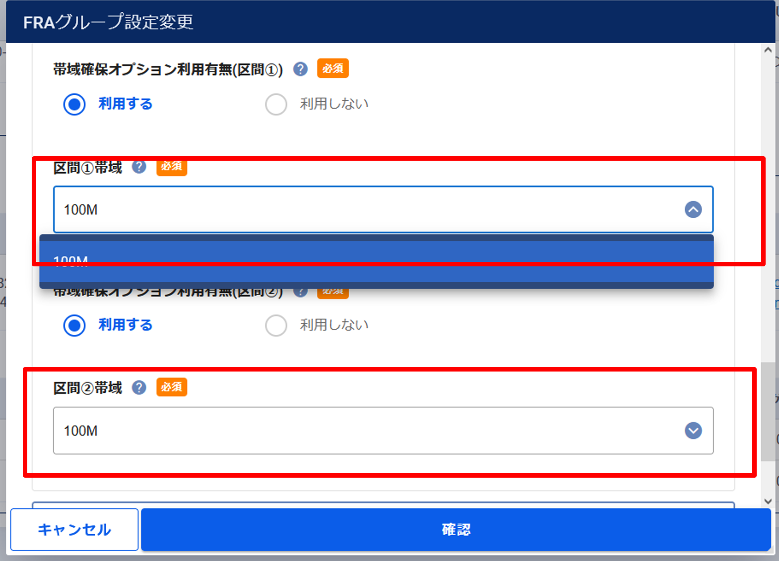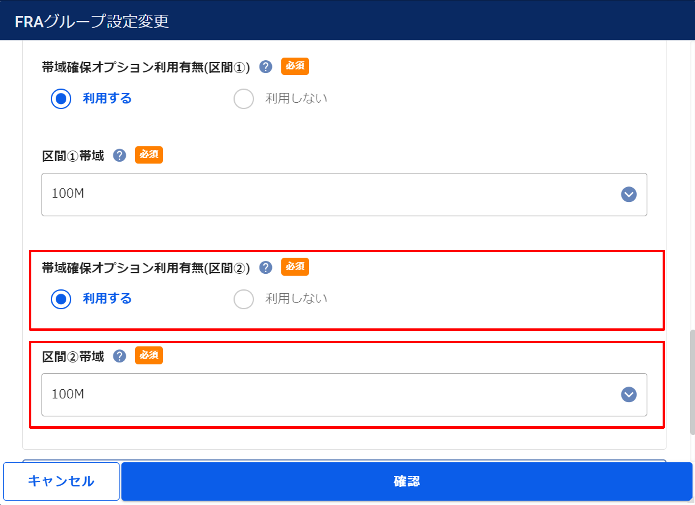 帯域確保オプション利用有無(区間②)の箇所の入力値を変更します。必要に応じて区間②帯域を選択します。